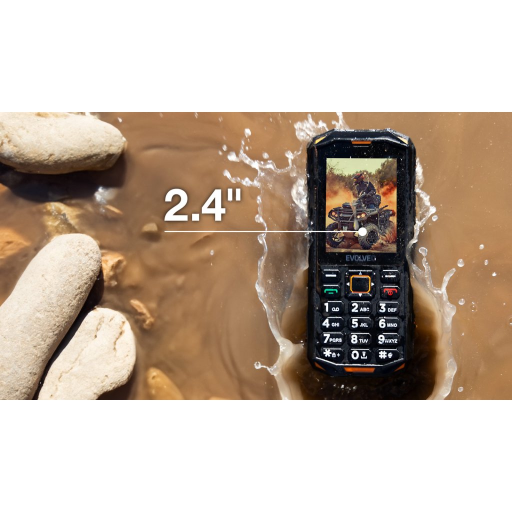Ergonomický design tlačítkového telefonu EVOLVEO StrongPhone X5 je doplněn pogumovaným povrchem, který zvyšuje odolnost telefonu a jeho snadné používání v náročných podmínkách. Tento voděodolný mobil splňuje normy IP68 a odolá náhodné vodě, sněhu, blátu i prachu a případným pádům a nešetrnému zacházení, které si vynutí situace při používání v extrémním prostředí. Účelnost a praktičnost designu telefonu je podpořena výraznými oranžovými prvky.