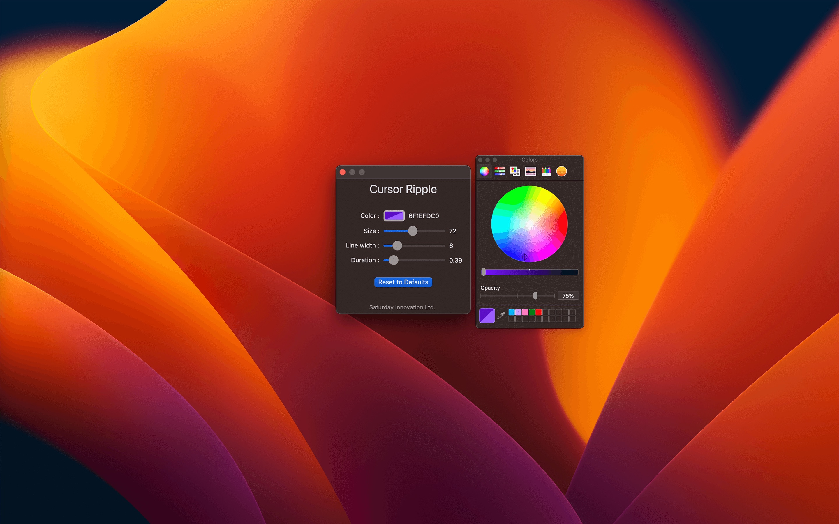 CursorRipple je jednoduchá aplikace pro macOS, která přehraje vlnění (ripple efekt) pokaždé, když kliknete levým tlačítkem myši. Můžete ji kdykoliv zapnout nebo vypnout pomocí ikony v liště. Také si můžete přizpůsobit barvu a velikost kruhu.