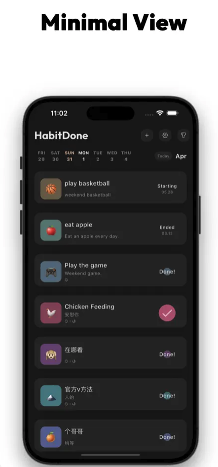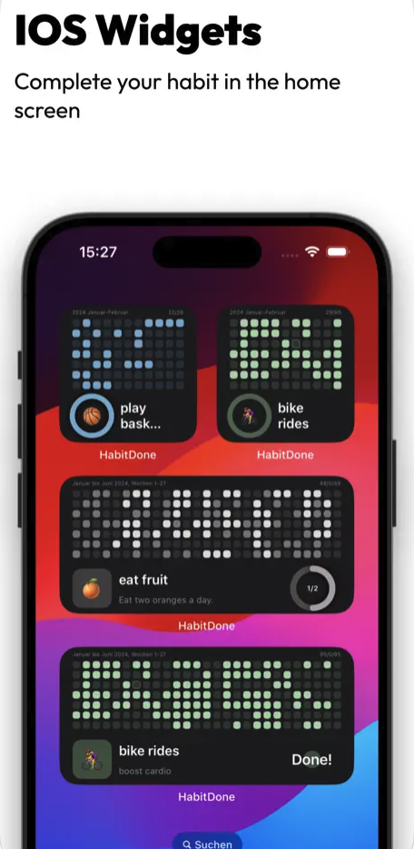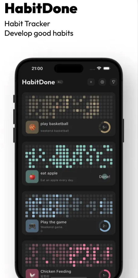 HabitDone je aplikace pro sledování návyků, která vás bude motivovat, abyste konečně dosáhli svých cílů. Začněte budovat zdravější návyky, které můžete přidat do svého každodenního života. Aplikace sleduje váš pokrok a poskytuje podrobnou analýzu dat, abyste viděli, jak se vám daří, a zařídit se podle toho.