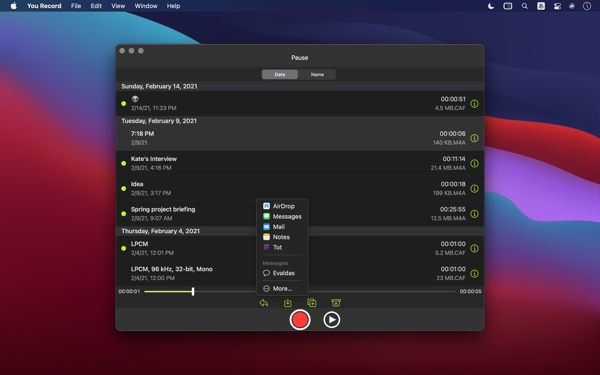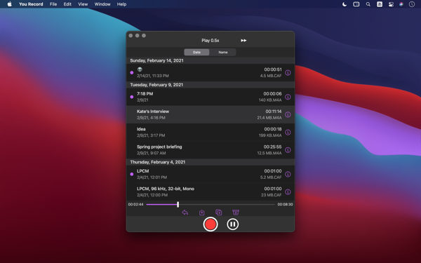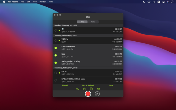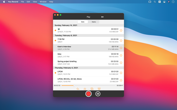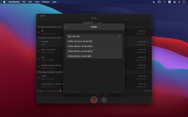 Hledáte nezničitelnou aplikaci pro nahrávání zvuku ať už jste spisovatel, novinář, historik, student, IT odborník nebo dokonce tajný agent? You Record Pro je uživatelsky přívětivá a spolehlivá aplikace pro Mac s podporou vysoce kvalitního komprimovaného formátu AAC.M4A a bezztrátového Linear PCM.CAF (nejbezpečnějšího 64bitového formátu Apple Core Audio).