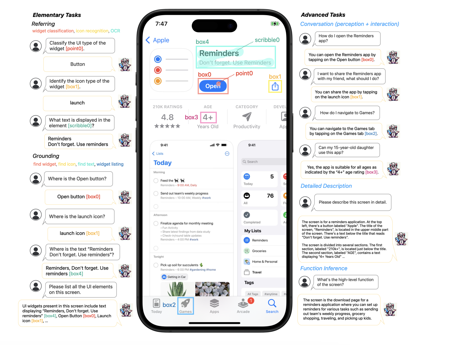 Aby se s tím Ferret-UI popasoval, zavádí funkci zvětšení, která zlepší čitelnost prvků na obrazovce zvětšením obrázků na požadované rozlišení. Tato schopnost zásadně mění interakci AI s mobilními rozhraními. Podle studie vyniká Ferret-UI v rozpoznávání a kategorizaci widgetů, ikon a textu na mobilních obrazovkách. Podporuje různé metody zadávání, jako je ukazování, ohraničování nebo skicování. Prostřednictvím těchto úloh získává model dobrou představu o vizuálních a prostorových datech, což mu pomáhá s vysokou přesností rozlišovat různé prvky uživatelského rozhraní.