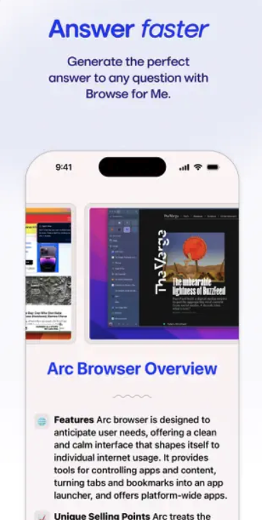 Arc Search je nejnovějším přírůstkem do nabídky mobilních webových prohlížečů a vyvinul se ze své desktopové verze, která byla původně uvedena na trh v roce 2023. Arc k vyhledávání za vás používá umělou inteligenci (AI). Ačkoli může chvíli trvat, než si na ni zvyknete, výsledkem je zajímavý způsob vyhledávání. Využitím funkce aplikace Browse for Me si můžete zobrazit typickou vyhledávací stránku, na které umělá inteligence shromažďuje informace ze šesti různých zdrojů. Tím získáte personalizovanou webovou stránku zobrazující všechny podstatné údaje potřebné k zodpovězení vašeho vyhledávacího dotazu.