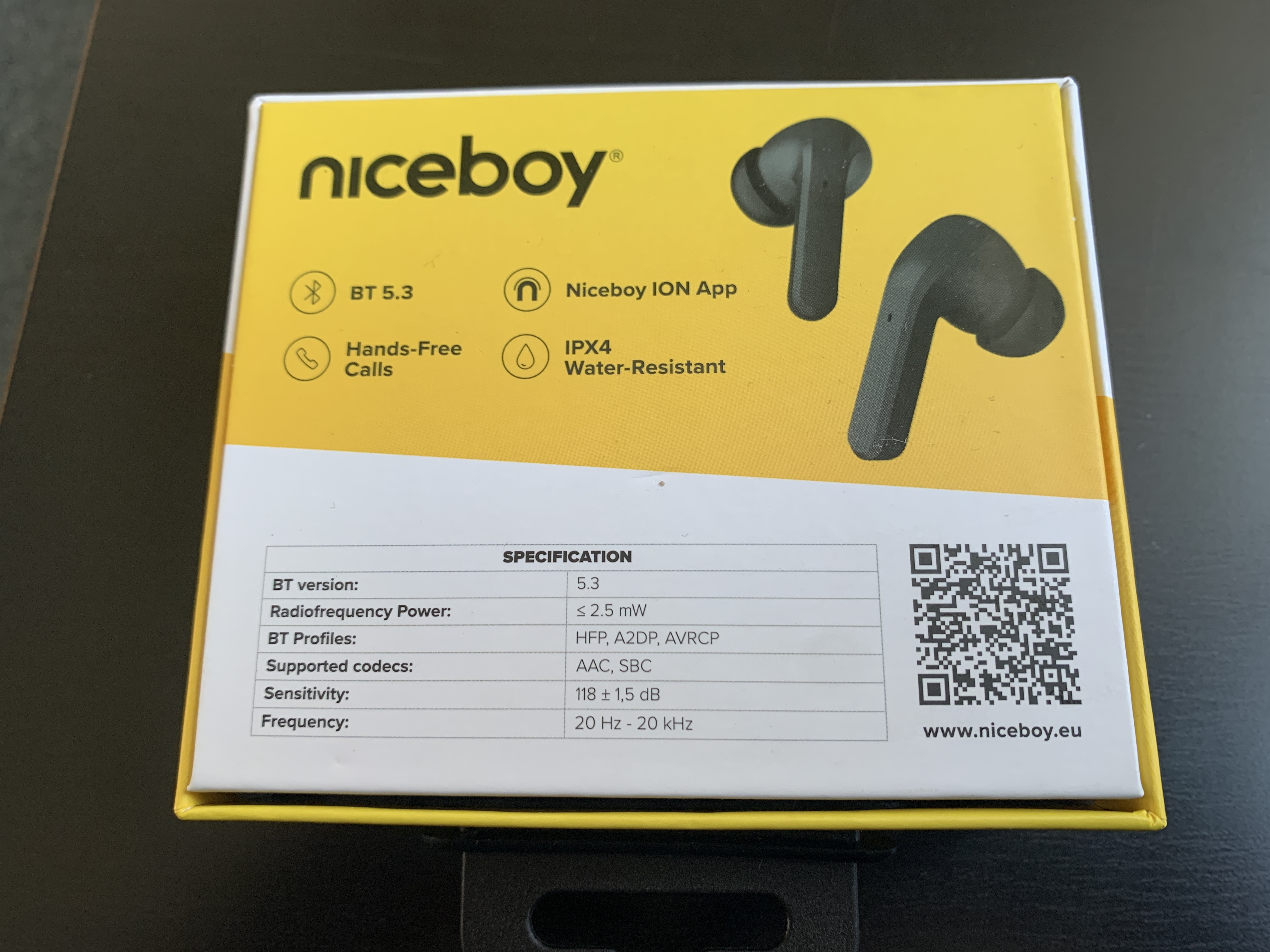 Samozřejmě se první mrkneme na krabici. Dorazí vám menší balení s klasickým designem bílé a žluté barvy, který je nyní společnosti Niceboy vlastní. Na každý pád z balení vyčtete několik technických specifikací, o nichž si ale povíme až o odstavec níže. Rovněž lze zpozorovat, jak budou sluchátka vypadat. V samotném balení naleznete manuál a USB-C nabíjecí kabel. Nic víc v podstatě nepotřebujete.