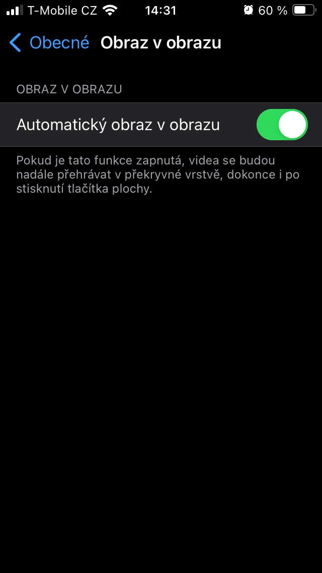 Obraz v obrazu je šikovným způsobem jak konzumovat multimediální obsah zatímco se zároveň věnujete něčemu jinému. Můžete tedy souběžně v plovoucím okně nad jinou aplikací kupříkladu sledovat film z Apple TV+ zatímco pročítáte nejnovější články na webu nebo prohlížíte příchozí poštu. Pakliže jste nabyli dojmu, že by vám takovýto multifunkční scénář používání iPhonu vyhovoval, přejděte do Nastavení, k Obecné, kde rozkliknete položku Obraz v obrazu a aktivujete přítomný přepínač označený Automatický obraz v obrazu klasicky pohybem vpravo.