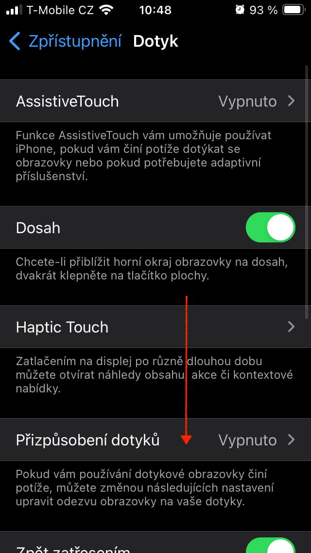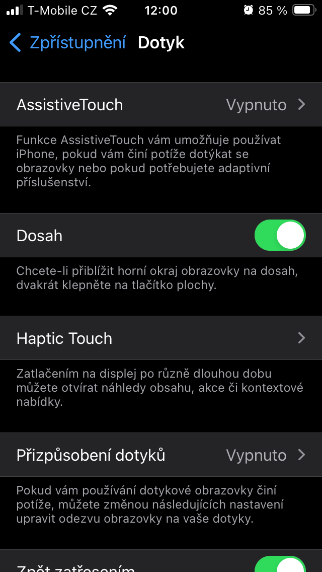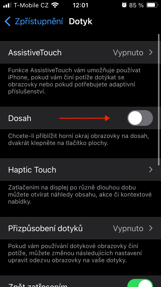 Pakliže občas máte dojem, že je plocha iPhonu příliš velká na to, abyste s ní mohli efektivně pracovat bez natahování prstu, nejspíš uvítáte, že i na to Apple mezi funkcemi zpřístupnění s přiblížením obsahu umístěného nahoře obrazovky iPhonu při ovládání jednou rukou myslel. Zapnout nebo vypnout ji lze v Nastavení, pod Zpřístupněním, kde klepnete v oddílu Mobilita a motorika na Dotyk a přepínač Dosah uvedete do požadované polohy. Následně budete moci přiblížit obsah horní části obrazovky přejetím prstem v oblasti jejího spodního okraje směrem dolů, u iPhonu SE pak docílíte téhož dvojitým klepnutím (nikoli stiskem) na tlačítko plochy. Pro opětovné roztažení pohněte prstem odspodu nahoru nebo na telefonech s Touch ID opakujte akci, případně se dotkněte šipky směřující vzhůru.