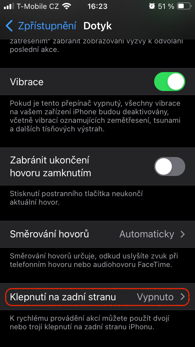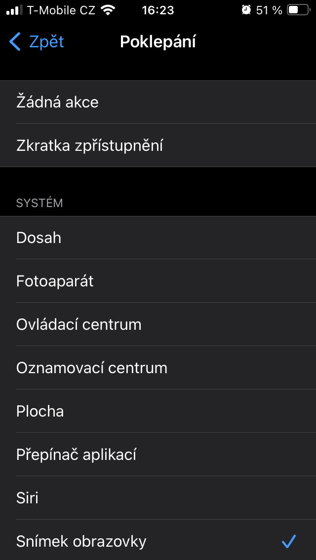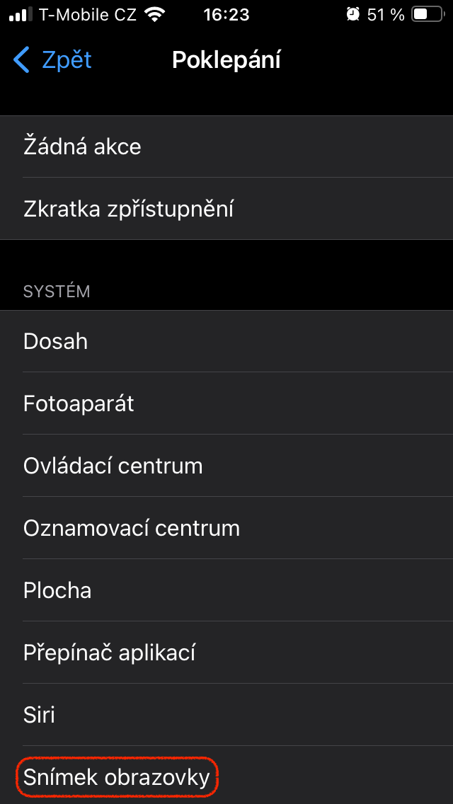 Dostáváte-li se často do situací, kdy je pro vás důležité opravdu rychlé pořízení snímku obrazovky, pak existuje poměrně šikovné řešení. V rámci funkcí zpřístupnění tuto operaci provedete ve vteřině – klepnutím na zadní stranu iPhonu. Pro povolení přejděte opět do Nastavení, skrolujte trochu níže ke Zpřístupnění, kde pod položkou Dotyk dole narazíte na pole Klepnutí na zadní stranu. Zde si stačí vybrat mezi dvojitým nebo trojitým a následně k němu z široké nabídky akcí přiřadit Snímek obrazovky. Dle okolností pak samozřejmě nic nebrání později zvolit například zapnutí svítilny, spuštění fotoaparátu nebo Siri.