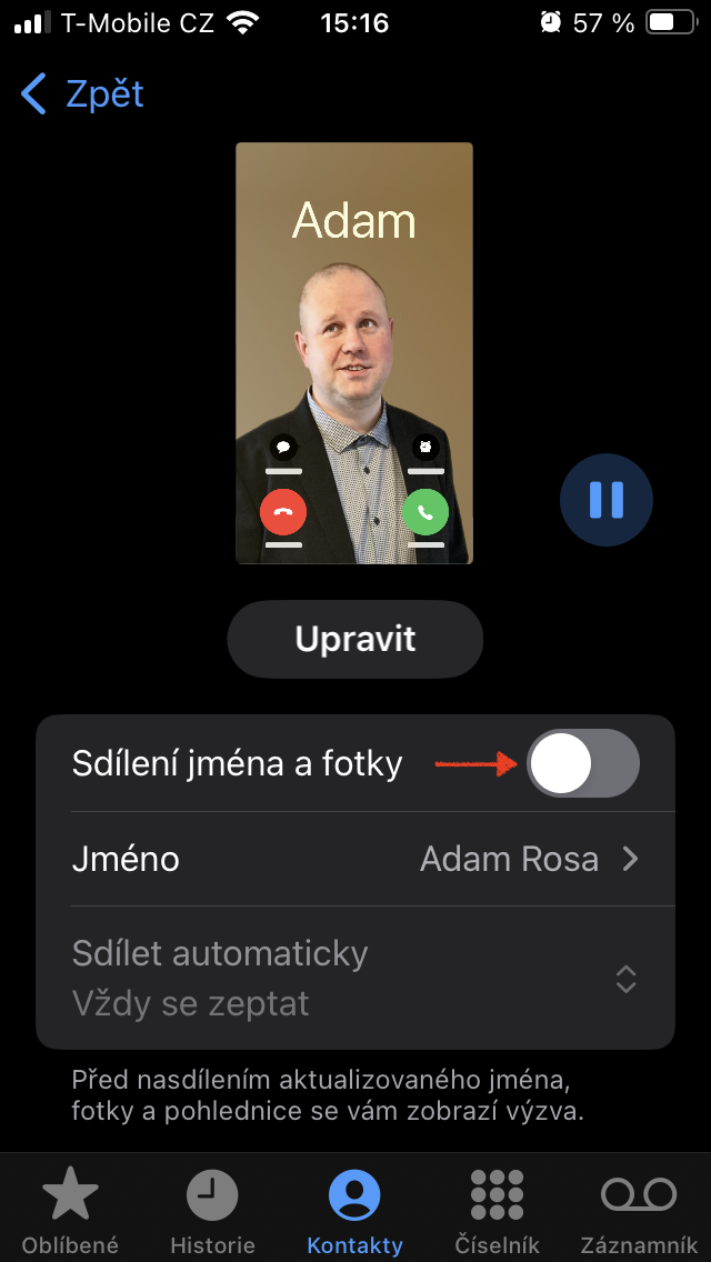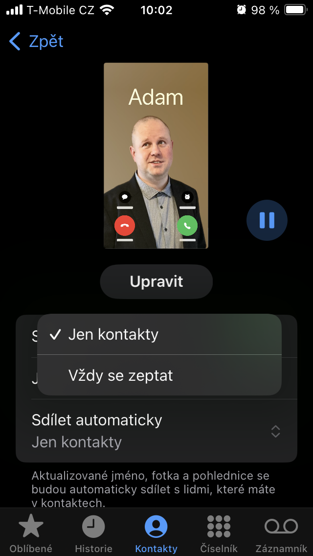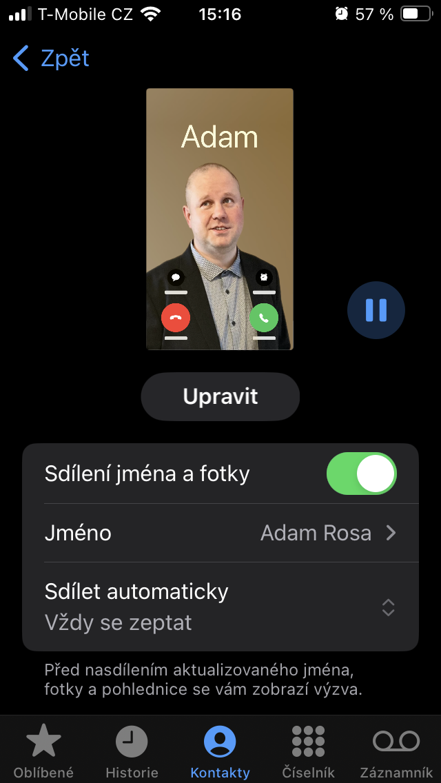 S iOS 17 dostaly Kontakty nový rozměr. Nic tak nestojí v cestě vyšperkování vizitky dle svých představ, včetně Fotografie kontaktu, která může a nemusí vycházet ze stejného snímku jako Pohlednice s efektním zobrazením přes celou obrazovku. Využít lze několik předpřipravených témat i přizpůsobení výřezu a své jméno zobrazovat některým z nabízených typů písma s volitelnou velikostí. Zbývá se rozhodnout, zda svou pohlednici chcete sdílet s přáteli a rodinou automaticky, nebo se uchýlit k variantě, kdy se systém pokaždé zeptá, zda je to žádoucí. K tomu je zapotřebí jen přejít na Kontakty, klepnout na svůj profilový obrázek a pod Fotka a pohlednice kontaktu povolit sdílení, přičemž rozevřením pole Sdílet automaticky se propracujete k výběru Jen kontakty nebo Vždy se zeptat.