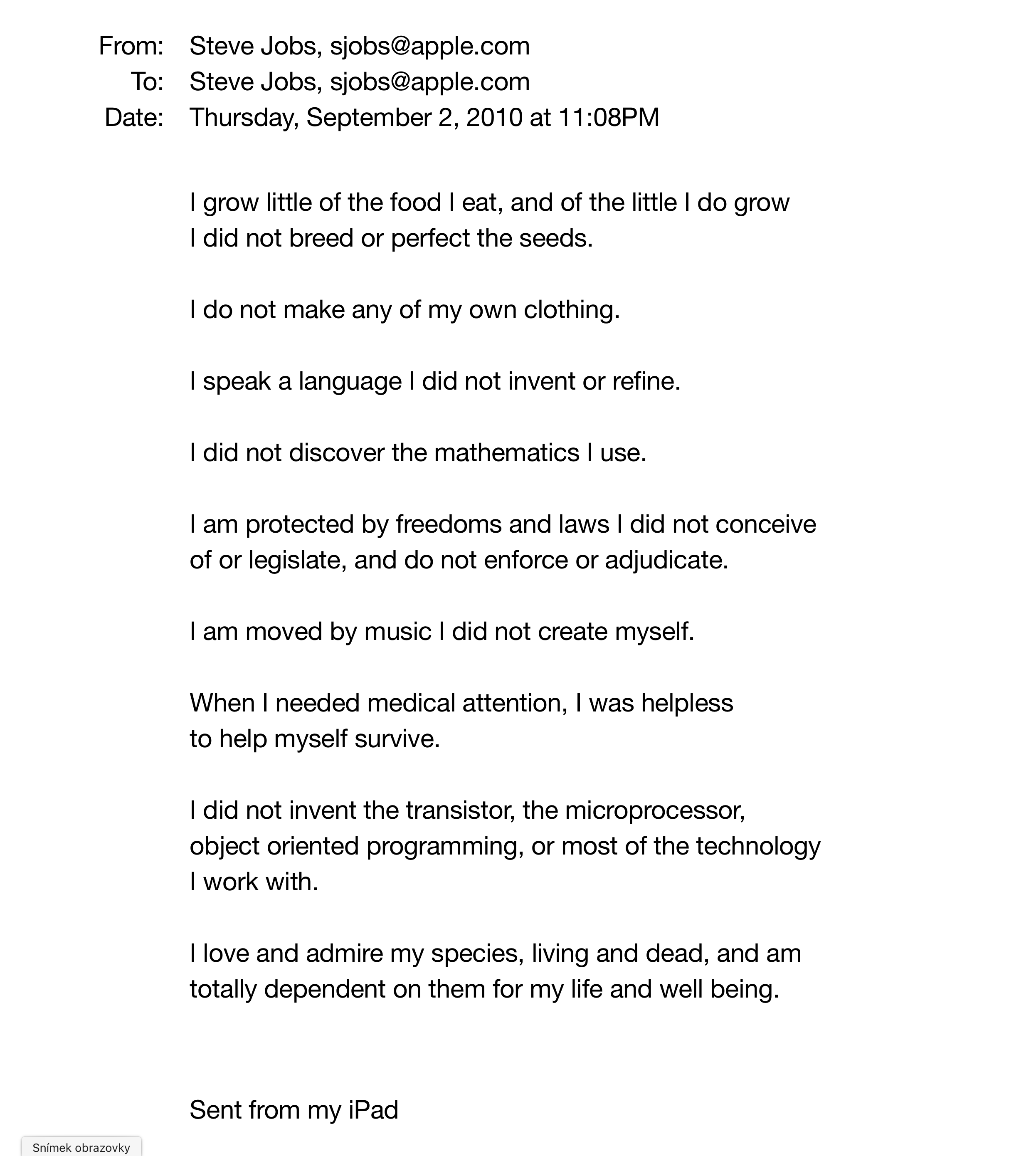 Rok před svou smrtí, konkrétně v září 2010 napsal Steve Jobs email sám sobě, ve kterém zachytil úžasnou myšlenku, která byla, je a navždy bude pravdivá a týká se každého jednoho člověka na světě. Jobs sepsal následujících pár řádků na svém iPadu před tím, než šel 2. září 2010 spát, bylo to totiž v 23:08. Email je natolik zajímavý, že jej zveřejnil oficiální archív Steva Jobse, který najdete na stránce stevejobsarchive.com. Pojďme se podívat, co sám sobě Steve Jobs toho večera napsal a zkusme se nad tím alespoň na pár vteřin zamyslet.