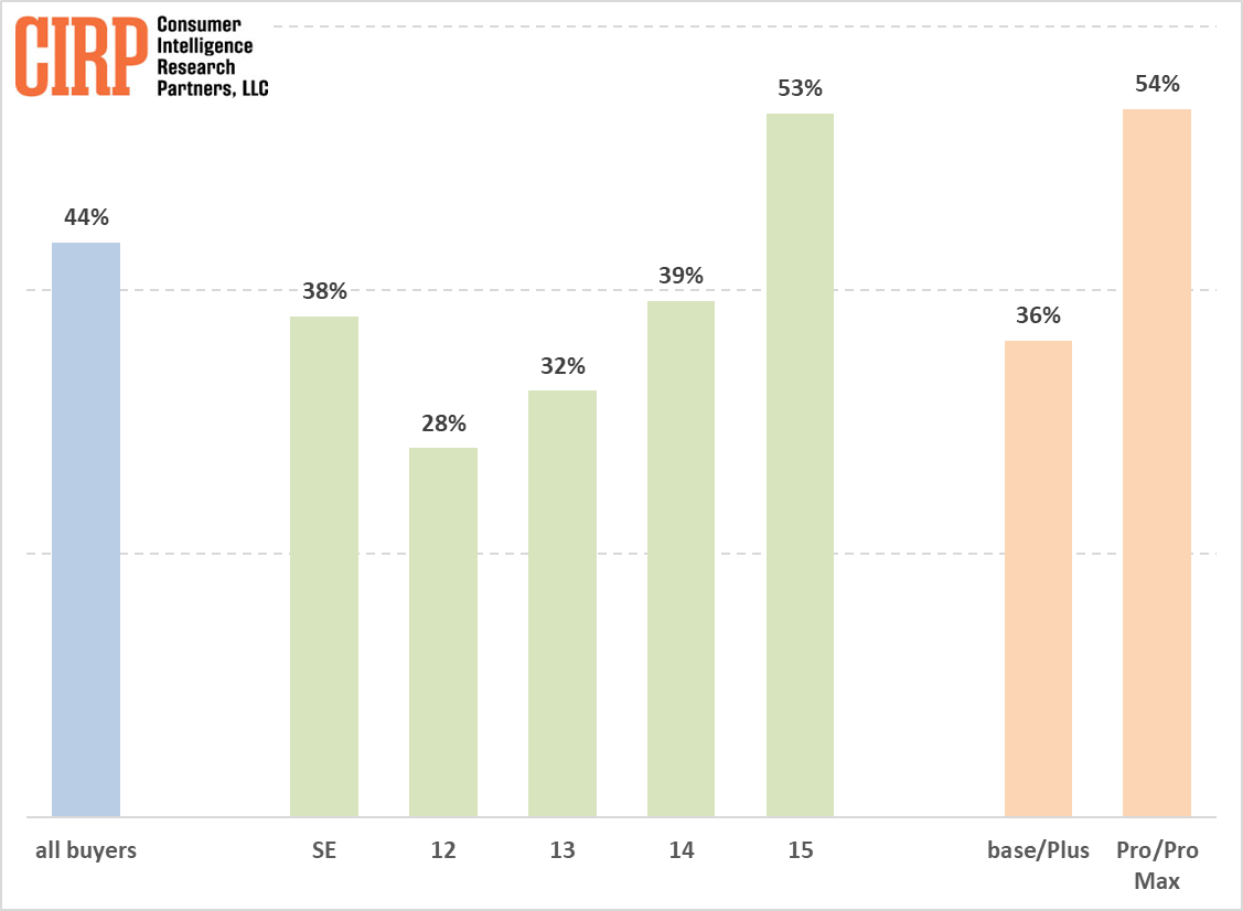 Zajímavý je také poměr přechodu na telefon s větším uložištěm v případě základních a „Pro“ modelů. Zatímco 54 % uživatelů při přechodu z jednoho na druhý Pro model nebo z přechodu ze základního na Pro model zvýší také uložiště svého telefonu, v případě přechodu mezi základními modely je to pouze 36 %. Je jasné, že čím dražší telefon lidé kupují, tím snadnější je pro ně investovat také do navýšení samotné paměti, ovšem, že to dělá více než polovina uživatelů je skutečně zajímavé.