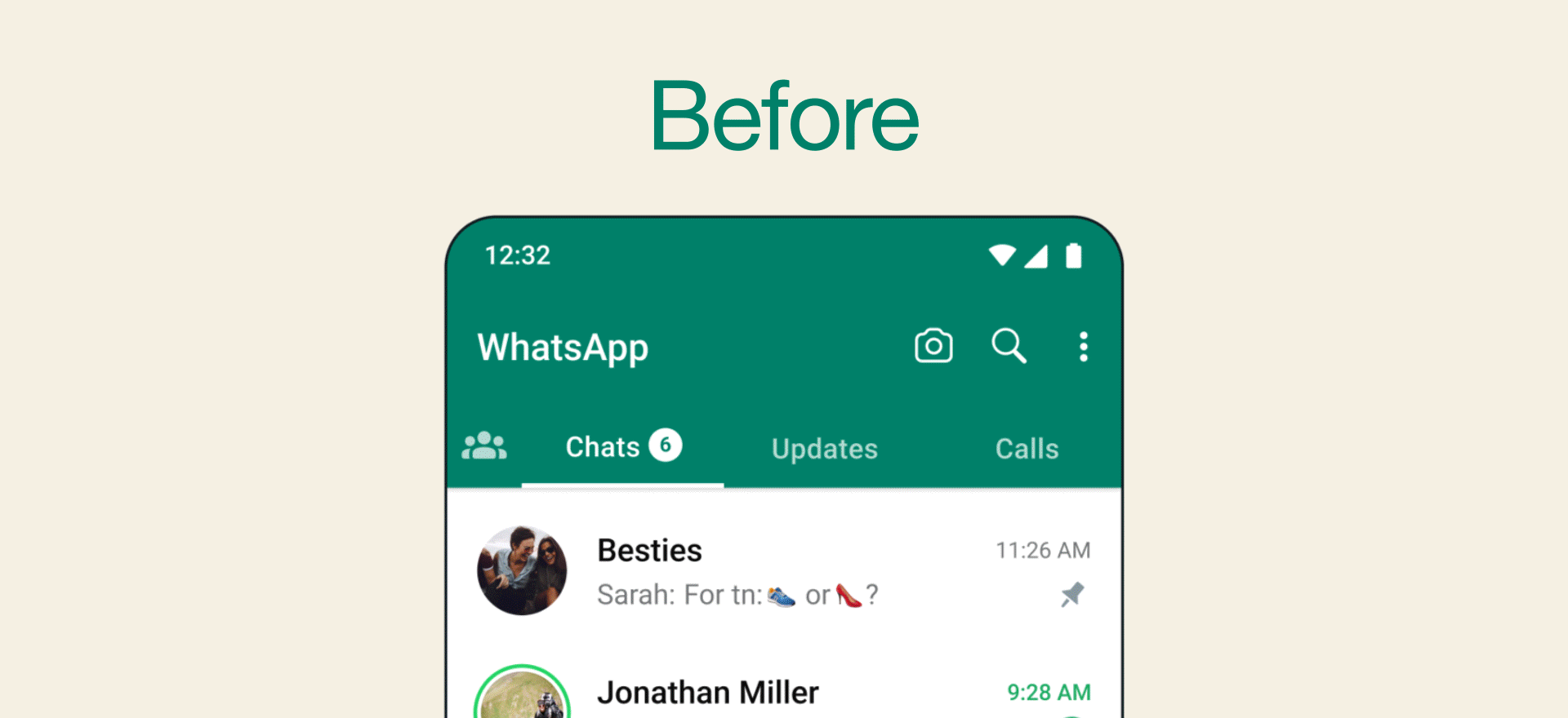 Hlavní prim v redesignu hraje změna barev, které WhatsApp doposud používal. Daleko větší prim bude totiž nově hrát zelená, které je sice pro aplikaci tou hlavní barvou již dlouhé roky, avšak nebyla v ní doposud až tak moc upřednostňována. To se ale nyní změní, jelikož zezelenají tlačítka, odznaky oznámení a tak podobně. Poměrně zajímavé je pak to, že na Androidu se rozhodl lištu nabídky karet přesunout do spodní části obrazovky, čímž tuto verzi aplikace designově výrazně přiblížil iOS verzi.