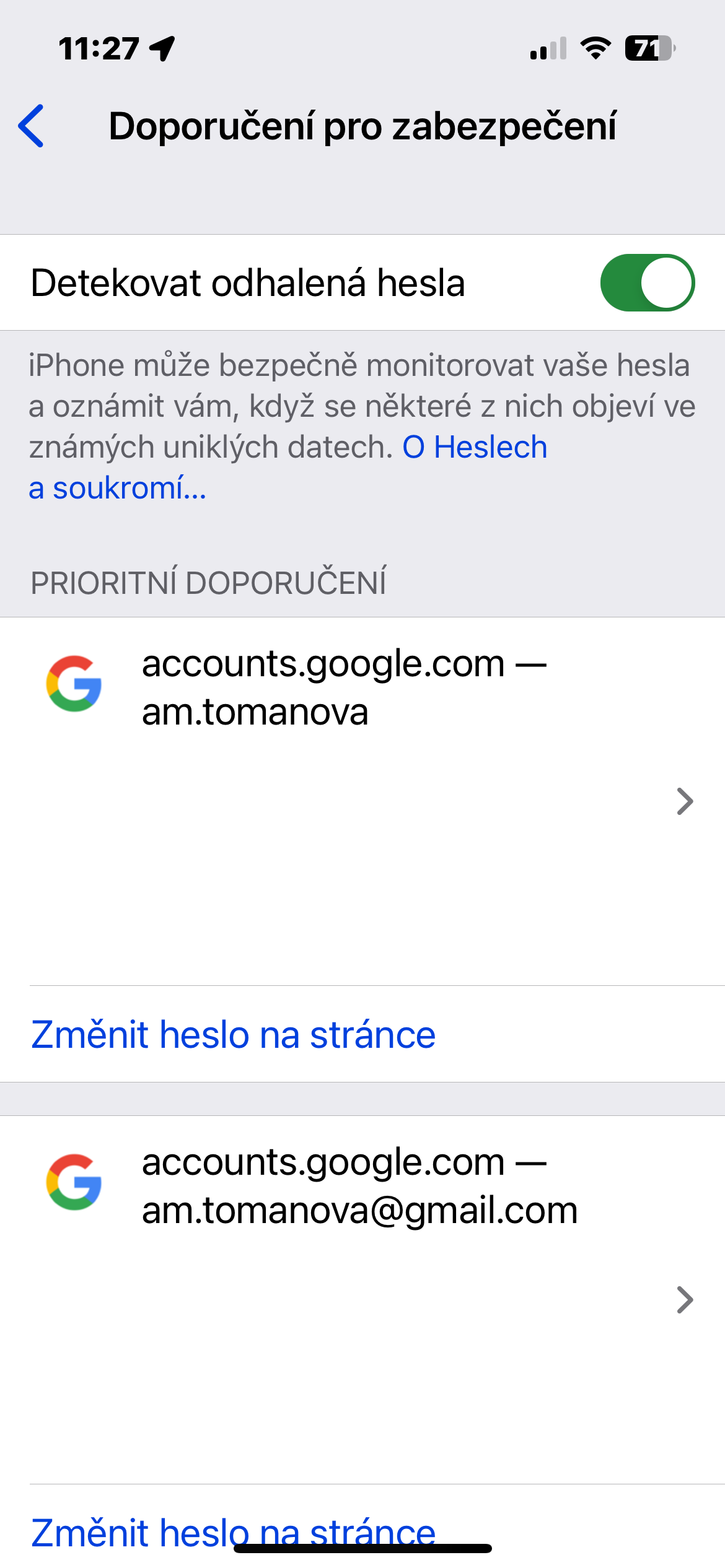 Zkontrolujte úniky hesel – na stránkách jako Have I Been Pwned si můžete ověřit, zda vaše e-mailová adresa nebo hesla nebyla součástí úniku dat. V případě úniku změňte hesla u všech postižených účtů. Bezpečnost hesel můžete zkontrolovat také v Nastavení -> Hesla -> Doporučení pro zabezpečení, kde si můžete aktivovat funkce detekce odhalených hesel.