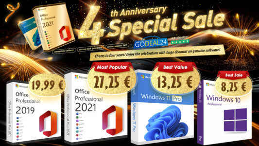 Komerční sdělení: Godeal24 slaví čtvrté výročí s vynikajícím výprodejem, který nabízí speciální ceny licencí MS prostřednictvím Godeal24’s 4th Anniversary Sale. V rámci výprodeje, který probíhá od 19. do 26. května, byly představeny také balíčky s více klíči. Pojďme si prohlédnout hlavní nabídky klíčů MS. Získejte doživotní licenci MS Office Professional 2021 za pouhých 27,25 €, zatímco původní cena je 439,99 €. Godeal24 vám ušetří více než 90 %. Pro firmu nebo rodinu je mnohem vhodnější klíč Office 2021 Pro pro 5 počítačů, který nabízí Office 2021 Professional za pouhých 17,25 € na počítač! Výkonný Office 2021 potřebuje ke své roli podporu operačního systému Windows! Pokud stále používáte starší verzi OS, využijte této nabídky a kupte si nejnovější Windows 11 Pro od šíleně nízkých 13,25 €. Pokud jste uvažovali o pořízení doživotní sady a OS Windows, je to skvělý způsob, jak si udržet více peněz v kapse. Časově omezená nabídka za chvíli skončí! Tým zákaznického servisu 7/24 vám nabídne bezplatnou pomoc, když se setkáte s problémy!