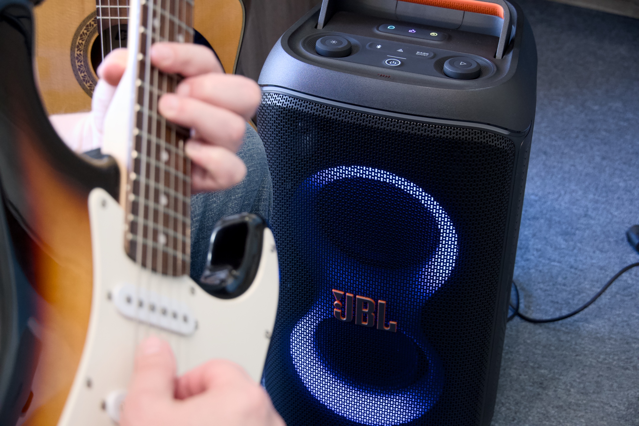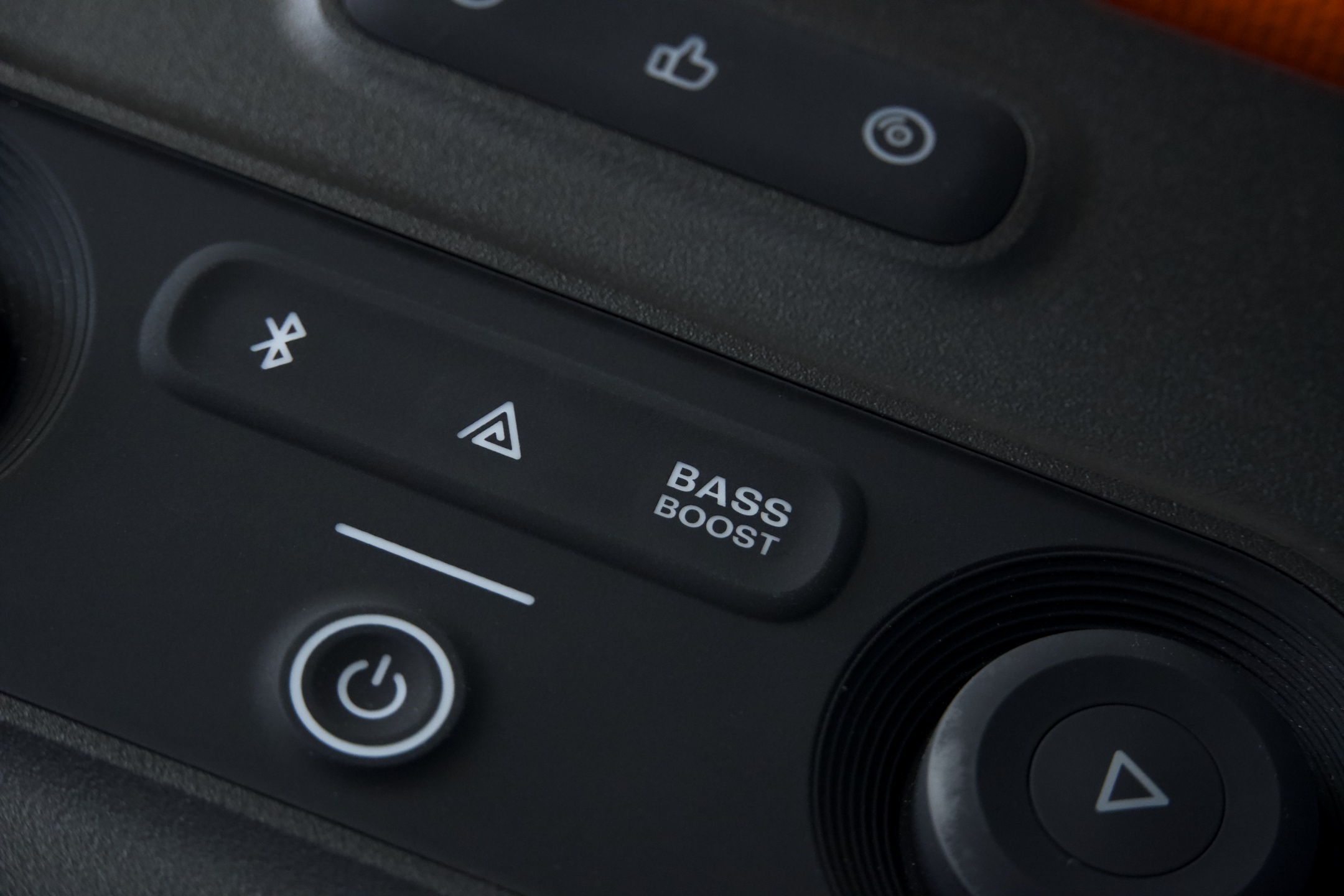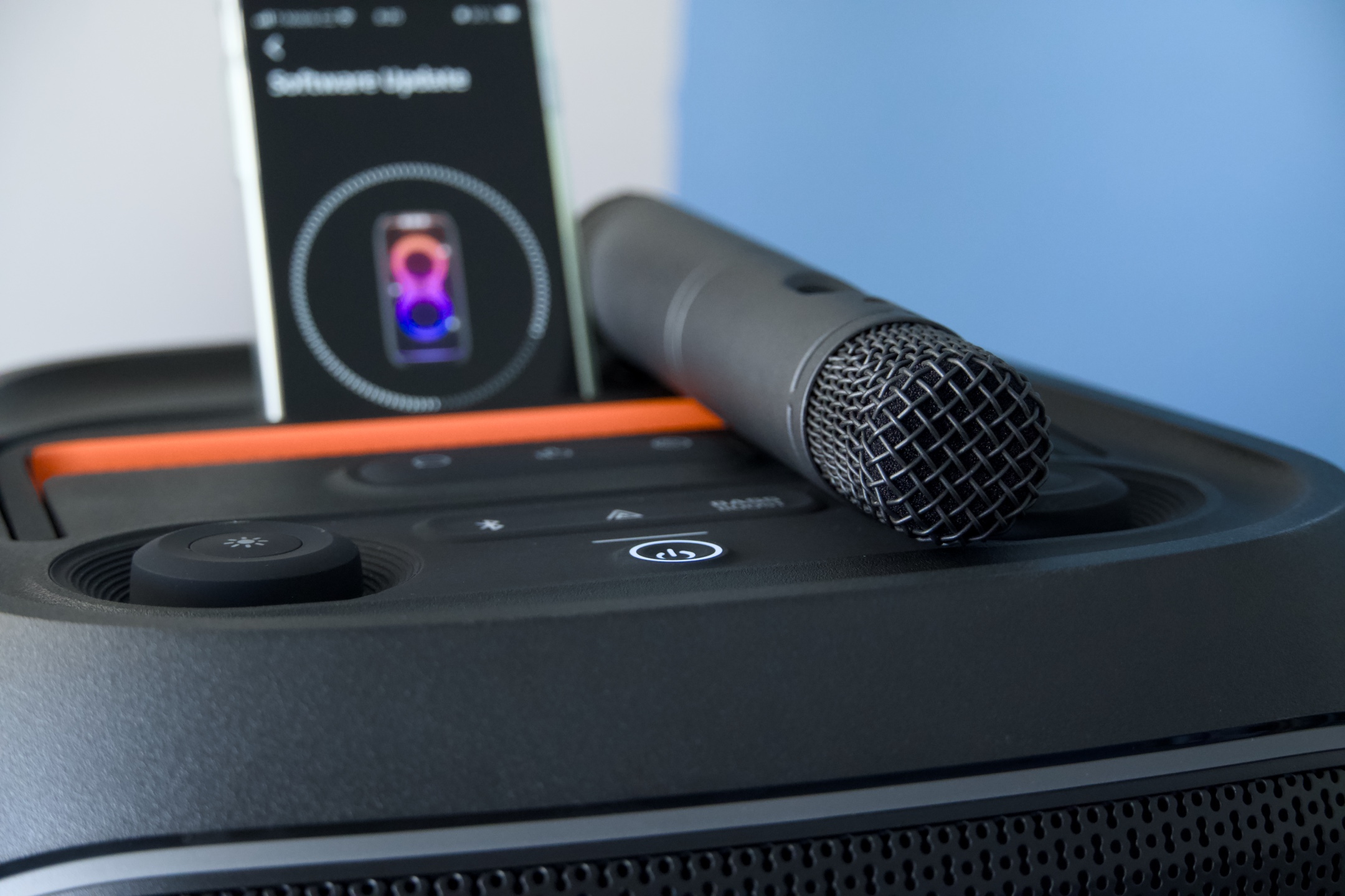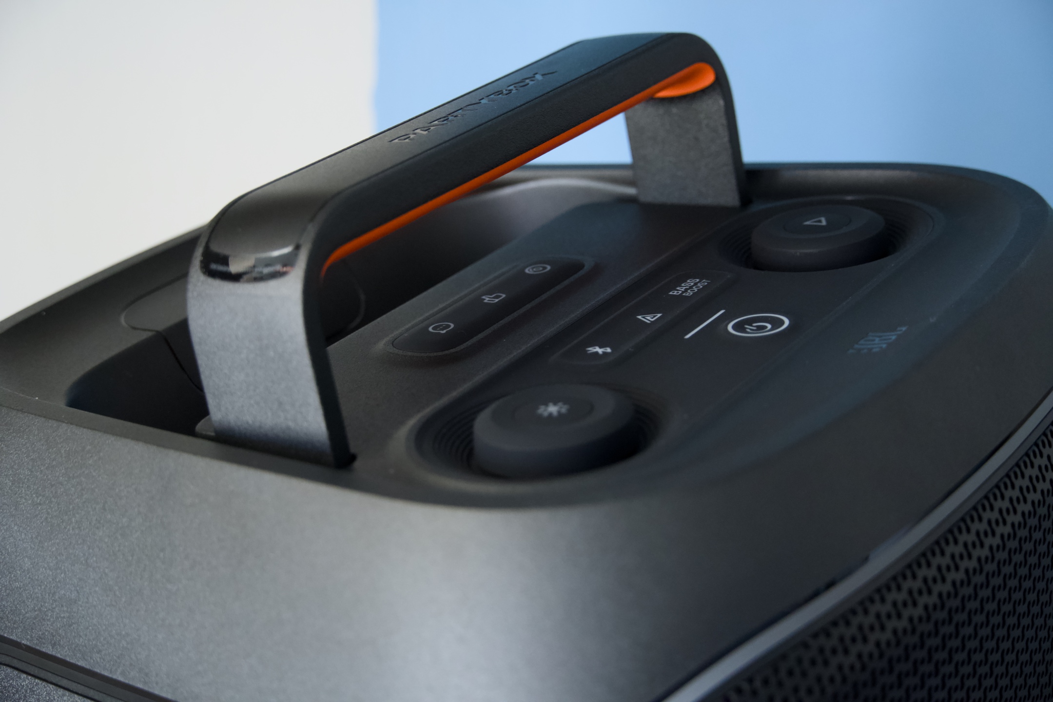 Ty z nejpodstatnějších prostředků ovládání v JBL zakomponovali do horního panelu, kterému dominuje zmíněná dvojice velkých otočných enkodérů, z nichž první (zleva) obstarává kontrolu nad světly, zatímco je funkce druhého spojena s přehráváním a celkovou hlasitostí. Z tlačítek se posluchači z jeho pohledu nejblíže nalézá vypínač, nad kterým první řada tlačítek zpřístupňuje funkci Bluetooth párování, vícenásobného bezdrátového propojení Auracast a způsobu nakládání z nižšími frekvencemi Bass Boost. Zbývající tři se symboly komiksové bubliny, zdviženého palce a gramodesky spouštějí vybrané zvukové vzorky, jejichž přiřazení je možné upravit ve jmenované aplikaci JBL PartyBox.