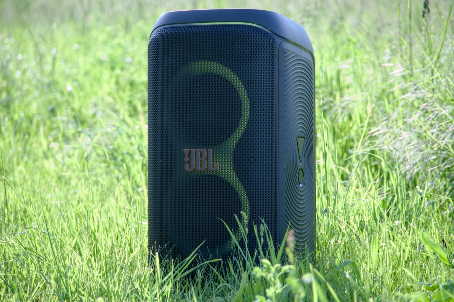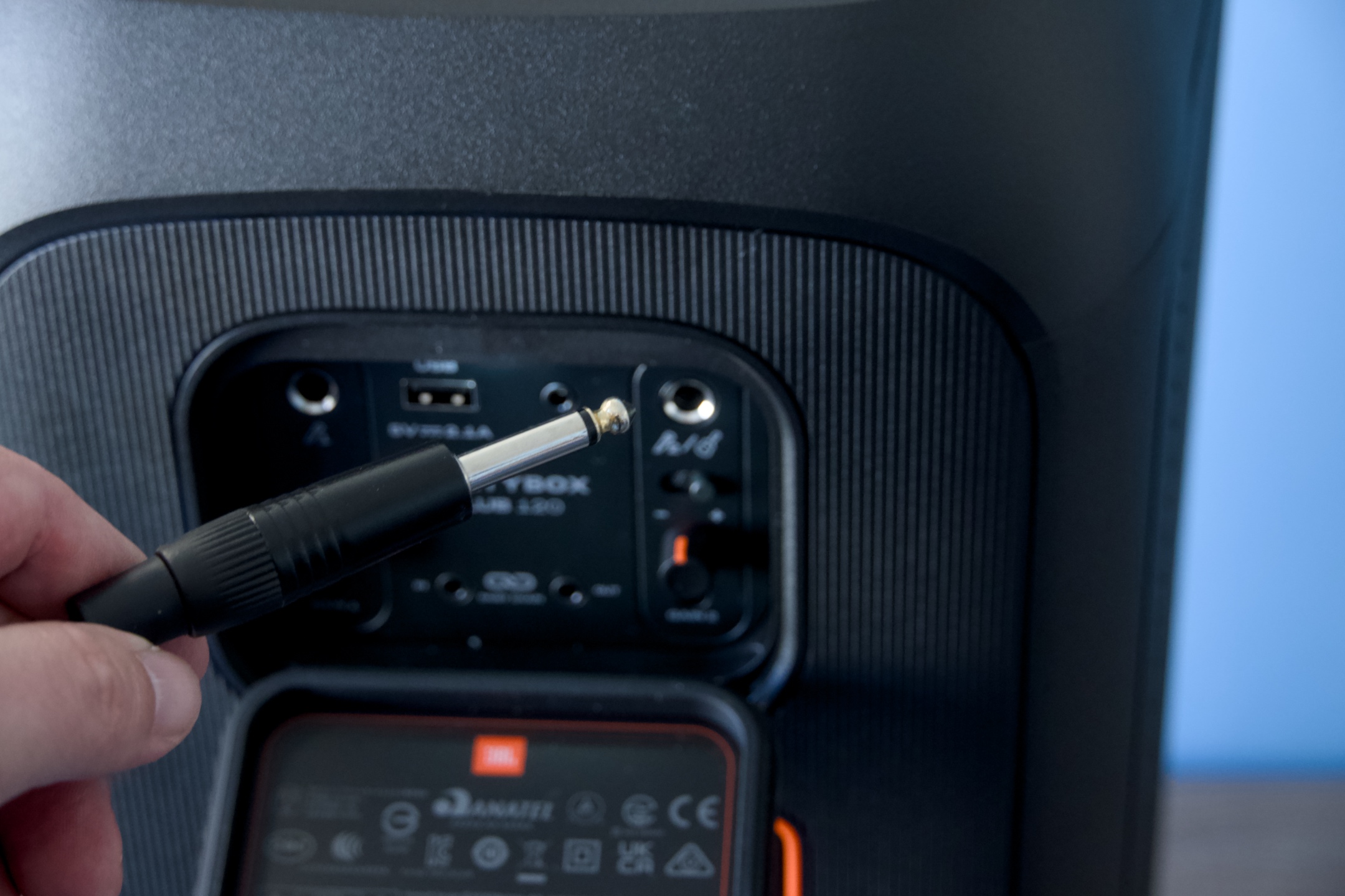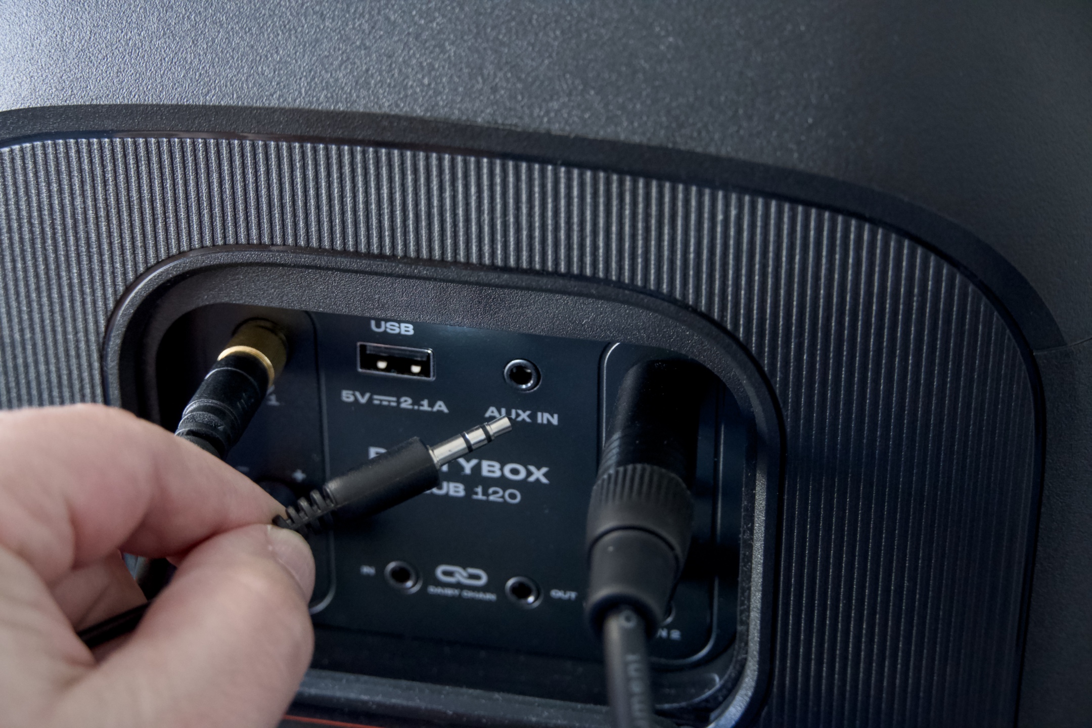 Hned na první pohled na sebe asi nejvíce upozorní velké logo na mřížce vepředu, která halí měniče i většinu ledek zprostředkovávajících světelnou show. Po stranách vyšperkovaných designovým vrásněním působí stejně symbol vykřičníku. Záda zdobí plastické vertikální šrafování a současně se zde nachází veškerá konektorová výbava chráněná krytkami. Ta čítá kromě napájení nejníže, port USB-A, dva 6,3 Jacky pro mikrofony či nástroj s potenciometry a přepínačem, 3,5mm stereo k připojení jakéhokoli externího zdroje signálu a jako poslední rovněž 3,5mm vstup i výstup určený pro potřeby řetězení s dalšími reproduktory. Uprostřed má pak PartyBox lůžko pro vyměnitelnou baterii.