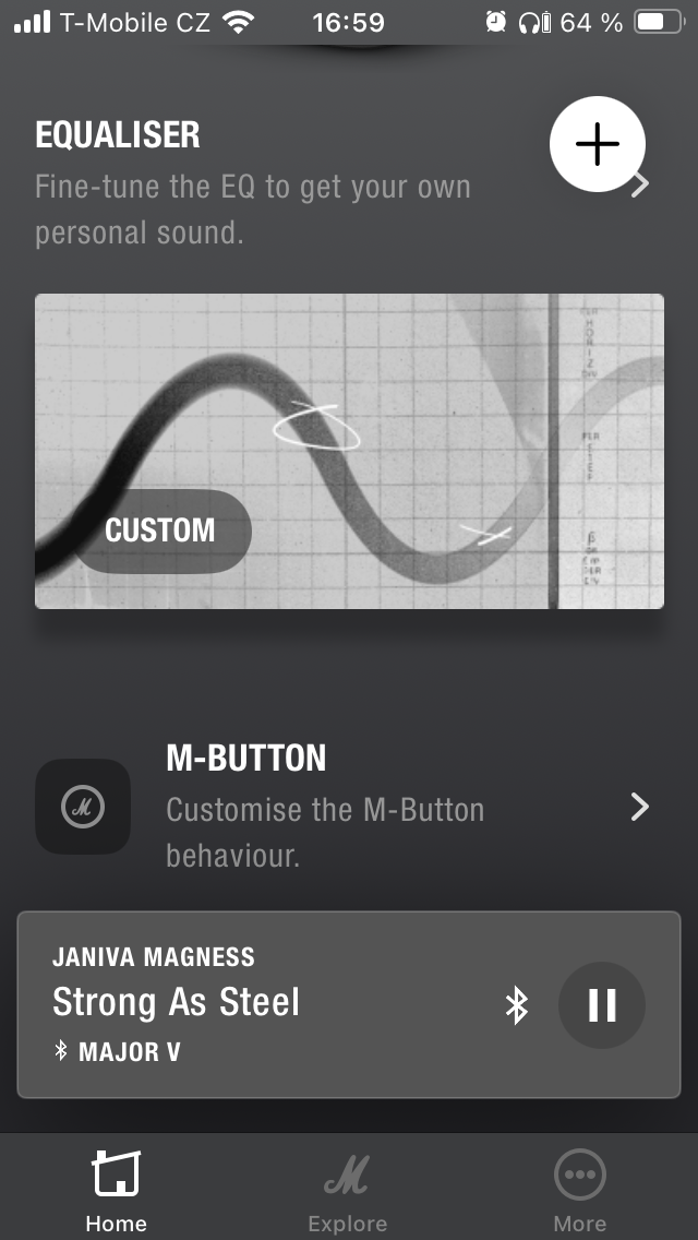 Myslím, že výchozí preset Marshall zbytečně upozaďuje vyšší frekvence, ovšem o to lépe dává vyniknout kytarovým rifům. Nejen s nimi spojené středy se prosazují tak akorát, aniž by sklouzávaly k agresivitě. Nejčastěji jsem přecházel (za přispění tlačítka „M“) právě mezi ním a vlastním nastavením Custom, kde mému uchu nejvíce lahodilo mírné posílení obou okrajů spektra. Pokud máte rádi hutné basy, pak stačí trochu zvednout slidery ekvalizéru nalevo a budete spokojeni.
