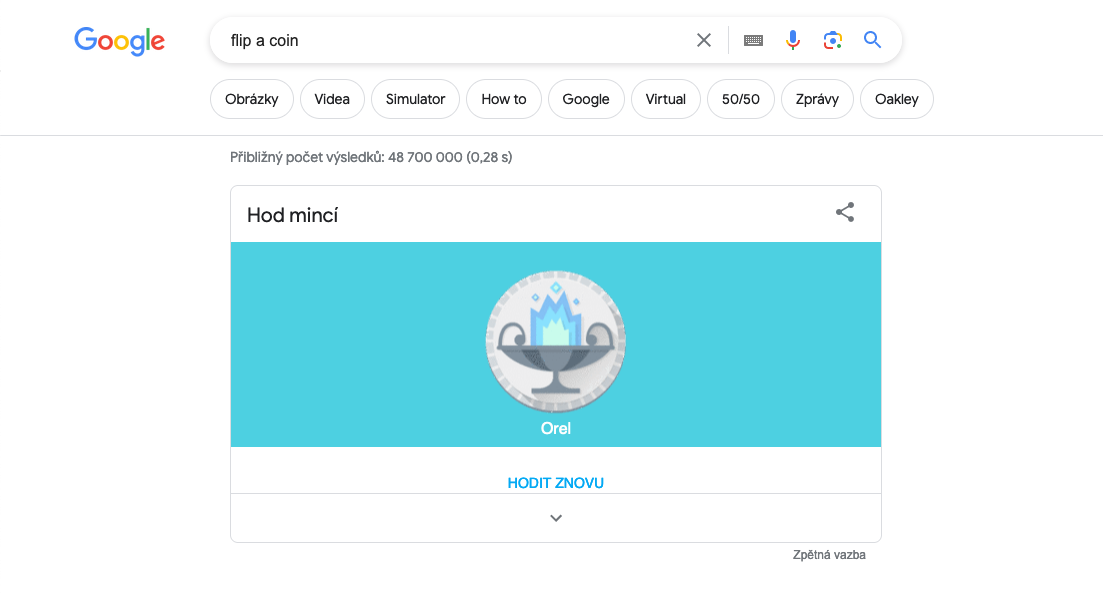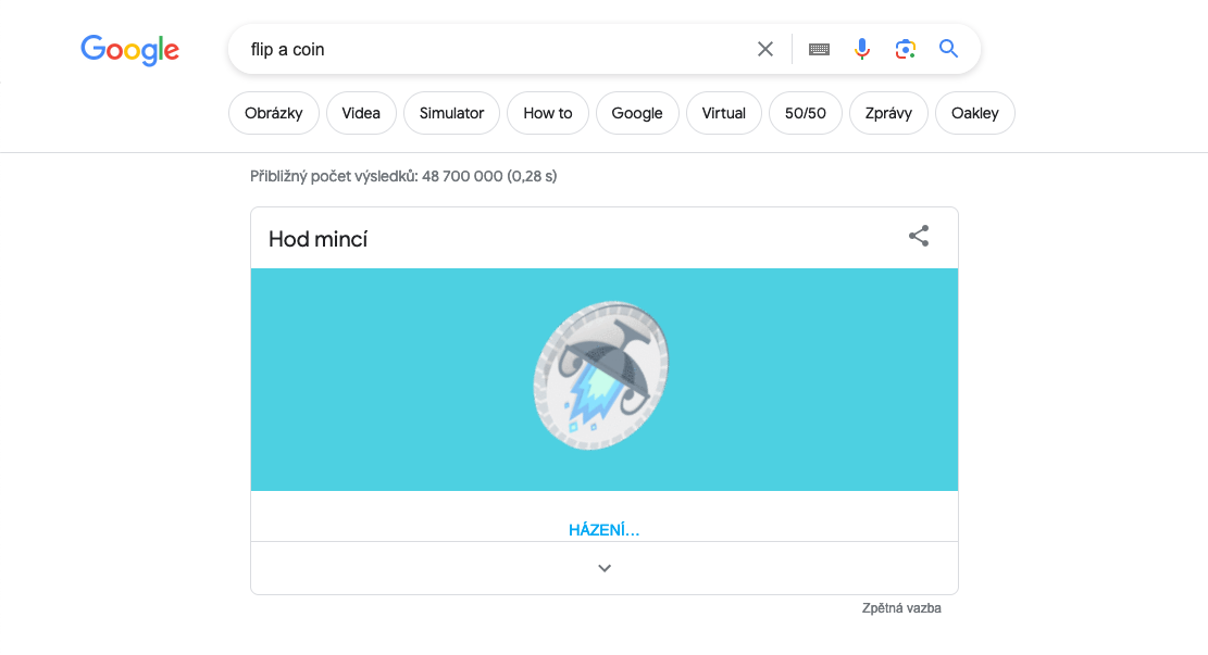 Není nic příjemného, když se ocitnete v situaci, kdy je potřeba o něčem rozhodnout, nevíte kudy kam a po ruce nemáte minci pro finální rozhodnutí. Naštěstí vám Google nabízí elegantní řešení v podobě virtuálního hodu mincí – stačí je do Googlu zadat výraz „Flip a Coin“ a Google hodí mincí za vás. Tato jednoduchá, ale užitečná funkce Google vám pomůže s drobnými i důležitějšími rozhodnutími, ať už si vybíráte mezi pizzou a těstovinami, nebo se snažíte určit, kdo začne hru.