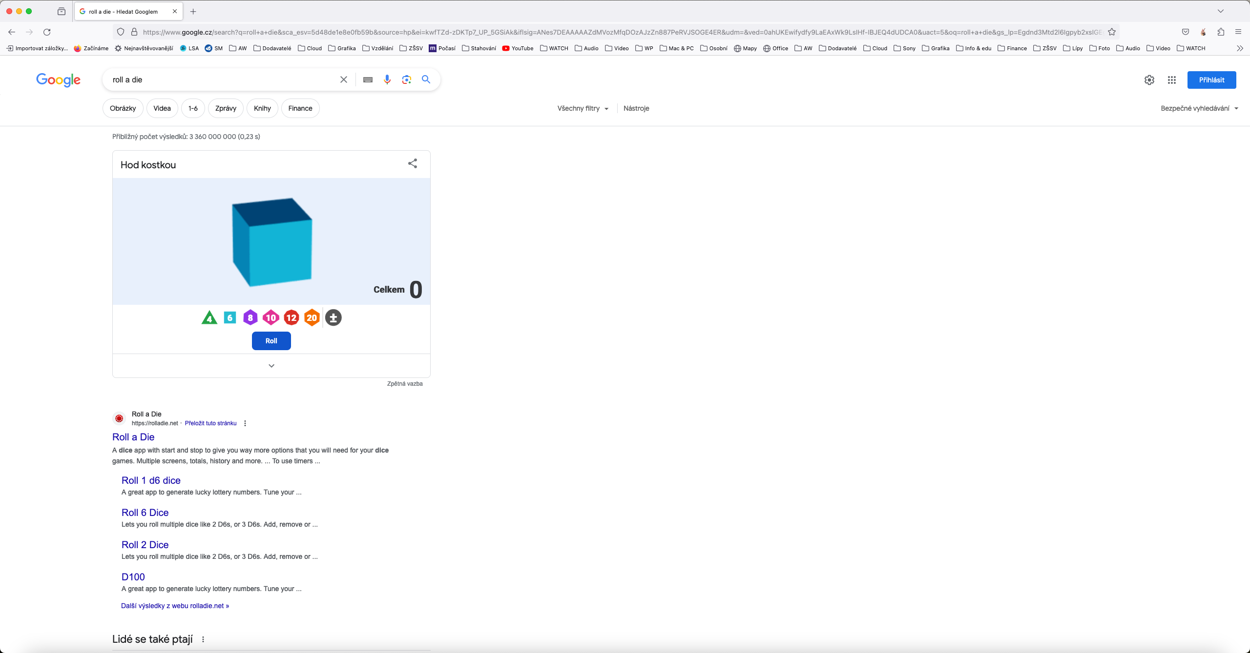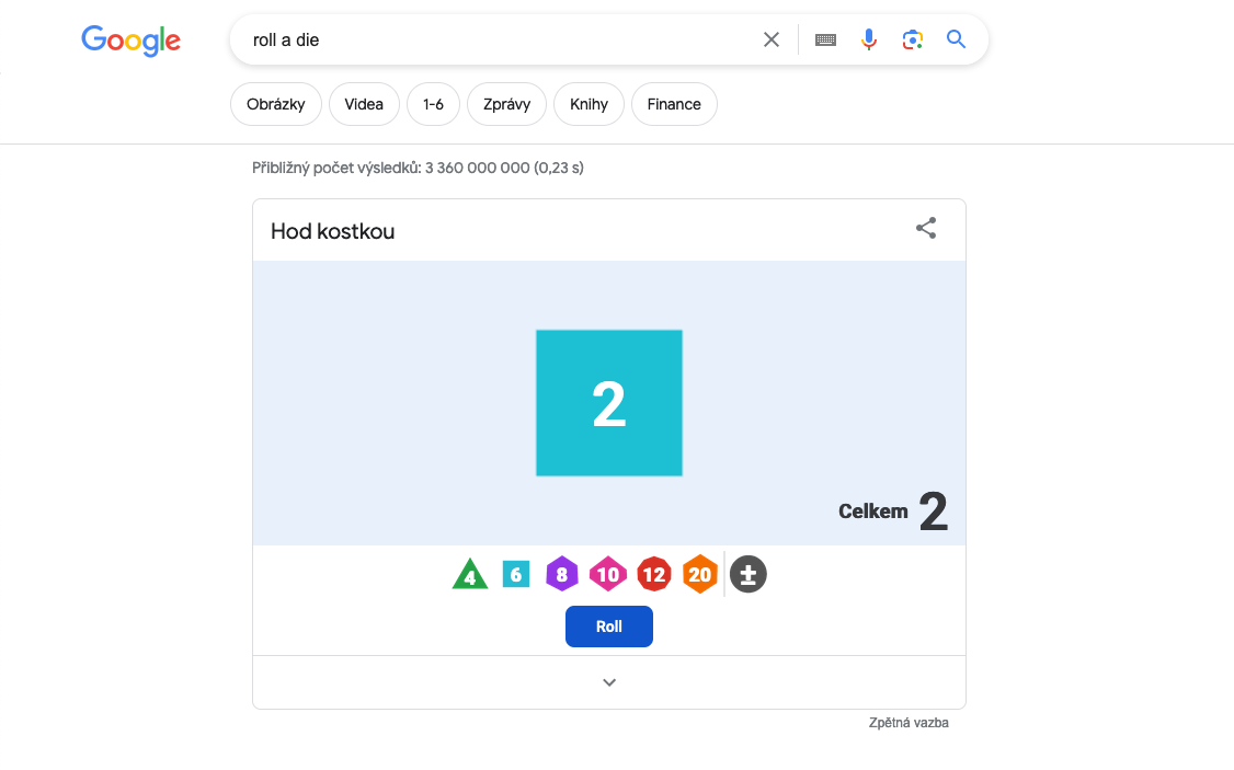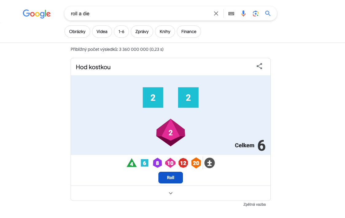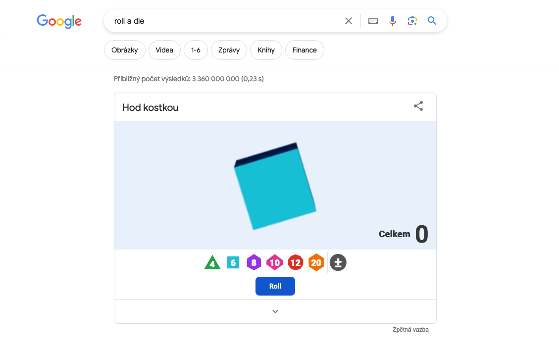Ocitli jste se v situaci, kdy byste si rádi zahráli nějakou zábavnou deskovou hru, ale nemáte po ruce kostku? Nevadí – Google vás nenechá ve štychu. Stačí do vyhledávacího pole v Google vyhledávači zadat výraz „roll a dice“ a Google vám umožní donekonečna házet virtuální hrací kostkou.