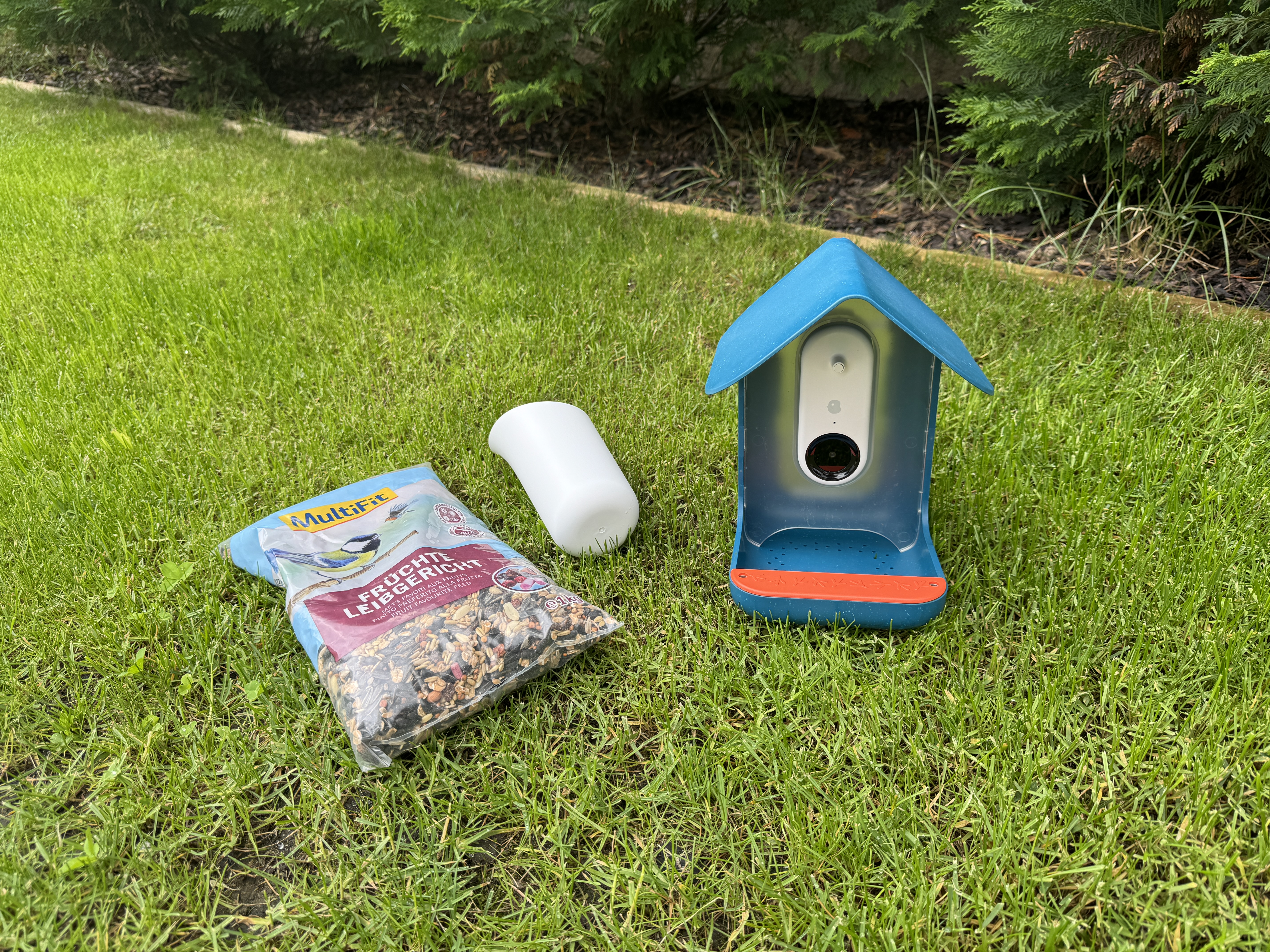 Krmítko se skládá ze dvou částí. Konkrétně bílého modulu, ve kterém je veškerá elektronika a je k budce připevněn pomocí magnetu, a pak modrého těla budky jako takové. Modul můžete jednoduše vytáhnout a nabít, aniž byste museli sundávat celou budku. Zároveň můžete čas od času vzít budku, vyndat elektronický modul a pořádně ji umýt pod vodou. Připevnění magnetem je praktická záležitost a budka tím, že má střechu a přesně zpracované tělo, do kterého dáváte modul s kamerou, přežije bez problému déšť, sníh či naopak ostré letní slunce.