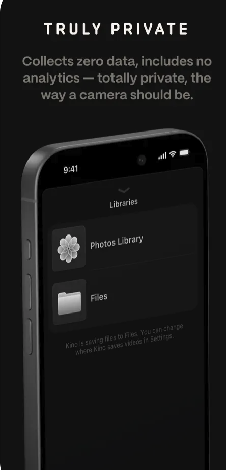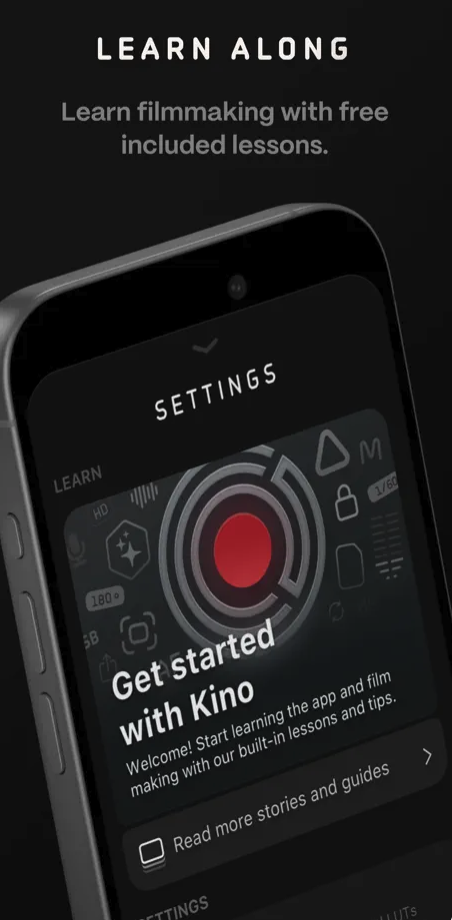 Uživatelské rozhraní nové aplikace Kino je navrženo pro snadné použití, ale zároveň nabízí také řadu profesionálních nástrojů. K dispozici jsou možnosti pro nastavení expozice pomocí úprav RV a AE, uzamčení WB nebo plně manuální režim pro ovládání rychlosti závěrky a ISO. Aplikace obsahuje nástroje pro rychlý přístup k úpravě rozlišení, snímkové frekvence, kódování a dalšího. Nechybí ani mřížka vodováh, RGB waveform pro nastavení expozice a peaking pro snadnější zaostřování. Kino umožňuje ukládat videozáznamy do aplikace Soubory namísto Fotky, což usnadňuje správu videí. Pro nováčky v oblasti nahrávání videa je k dispozici řada lekcí, které je naučí využívat všechny funkce aplikace Kino.