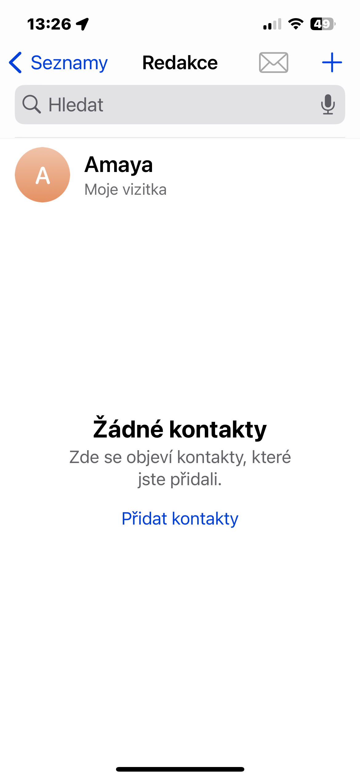 - Další kontakty můžete přidat klepnutím na ikonu + vpravo nahoře v seznamu.