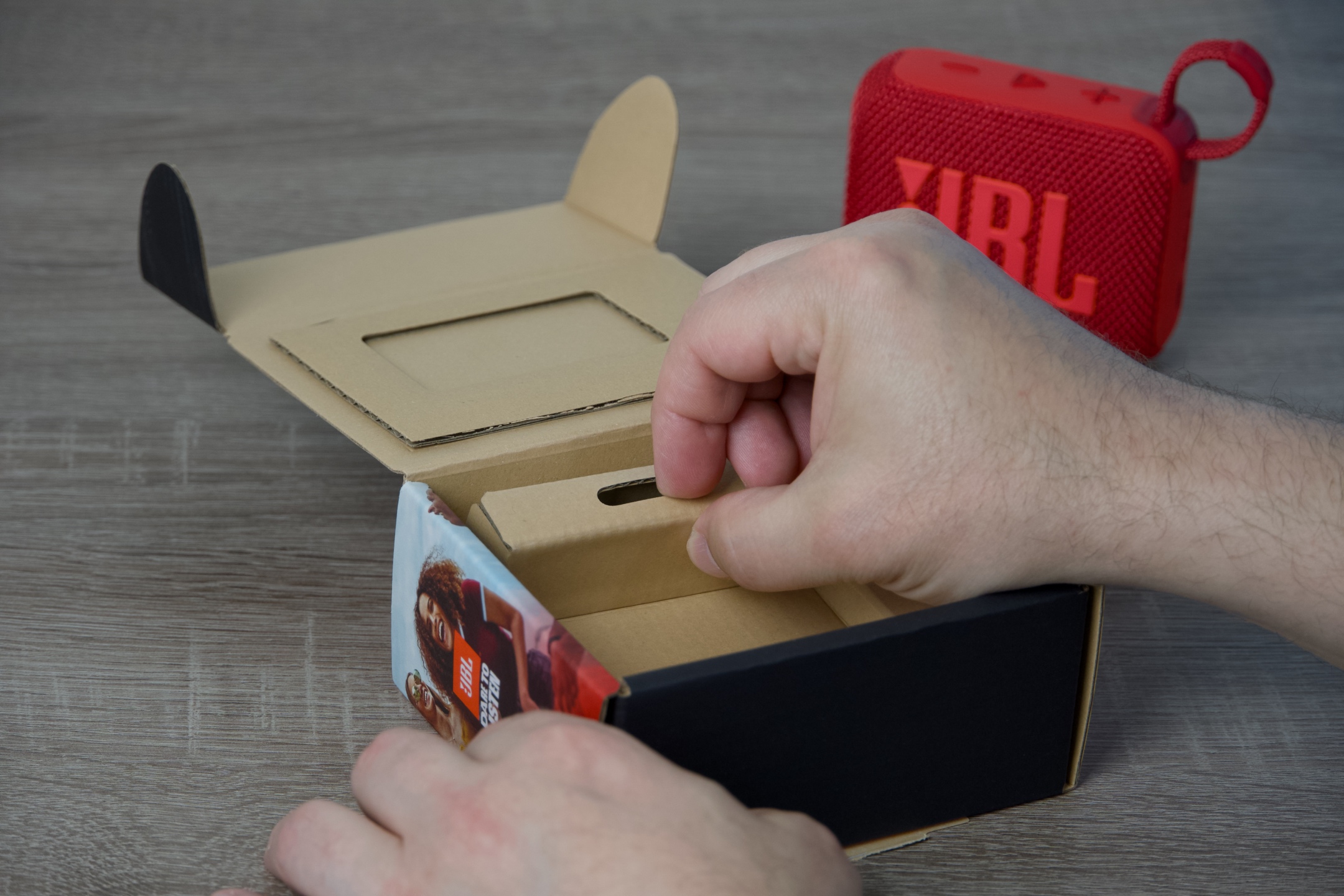 Nevelkou krabičku s potiskem ze sójového inkoustu odpovídajícím vybrané barevné variantě otevřete přetrhnutím papírového pásku vespod a následným nadzvednutím přední strany balení. Ihned po odklopení víka se před vámi objeví samotný produkt zasazený do kartonového lůžka. Stačí uchopit poutko a GO 4 pohodlně vyjmout. Poté zbývá zaměřit pozornost na zbytek obsahu, konkrétně k výřezu, pod nímž se ukrývá napájecí kabel USB-A na USB-C a dokumentace. Pak už nic nebrání tomu, abyste se pustili do instalace aplikace JBL Portable, párování a začali si užívat oblíbené tracky.