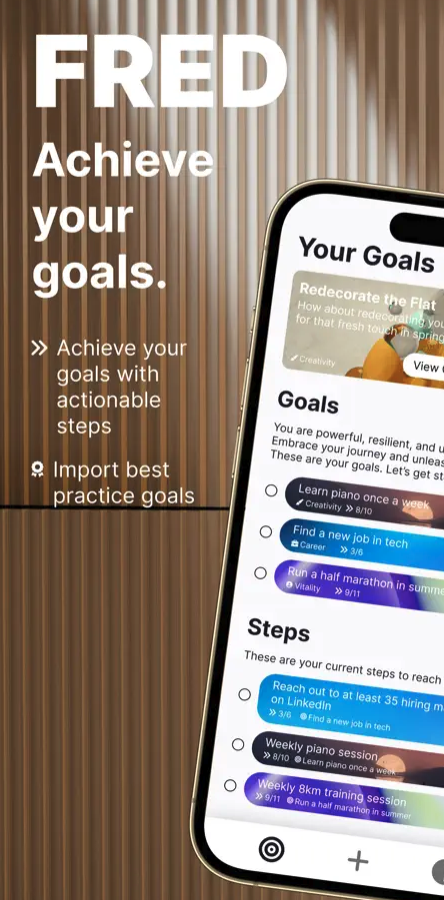 Fred je aplikace pro iOS, která vám pomůže stanovit a sledovat vaše cíle. Můžete si tak plánovat, jak své cíle dosáhnout pomocí konkrétních kroků. Mezi hlavní funkce aplikace Fred patří možnost stanovení vlastních cílů a sledování jejich průběhu, možnost rozdělení cílů do jednotlivých kroků, a inspirovat se můžete také předpřipravenými cíli.