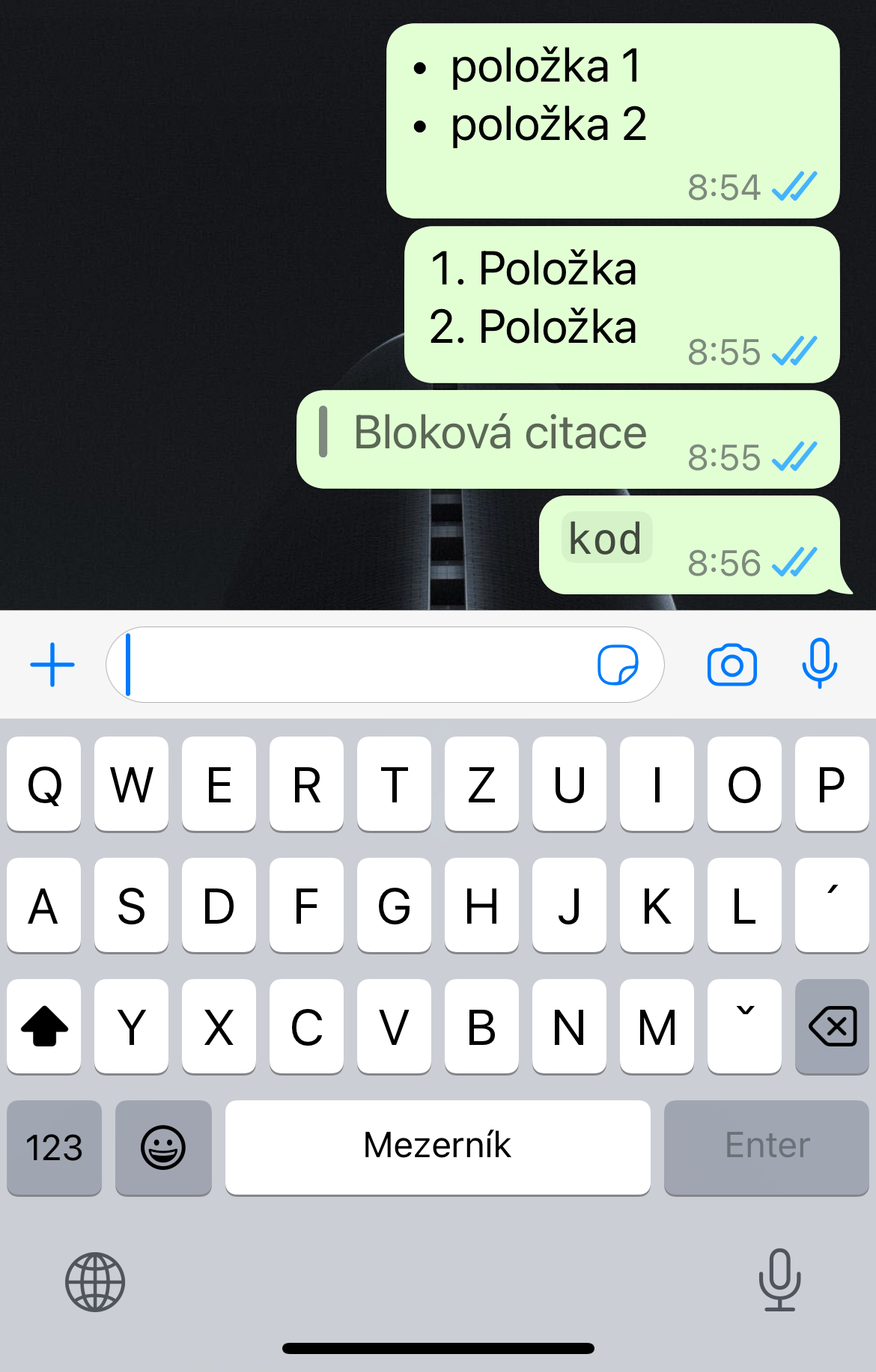 Ve WhatsAppu pro iOS jsou již nějakou dobu k dispozici funkce pro tvorbu seznamů s odrážkami, číslovaných seznamů, blokových citací a vloženého kódu. Tyto novinky usnadňují organizaci informací, sdílení receptů, vytváření to-do listů a mnoho dalšího.