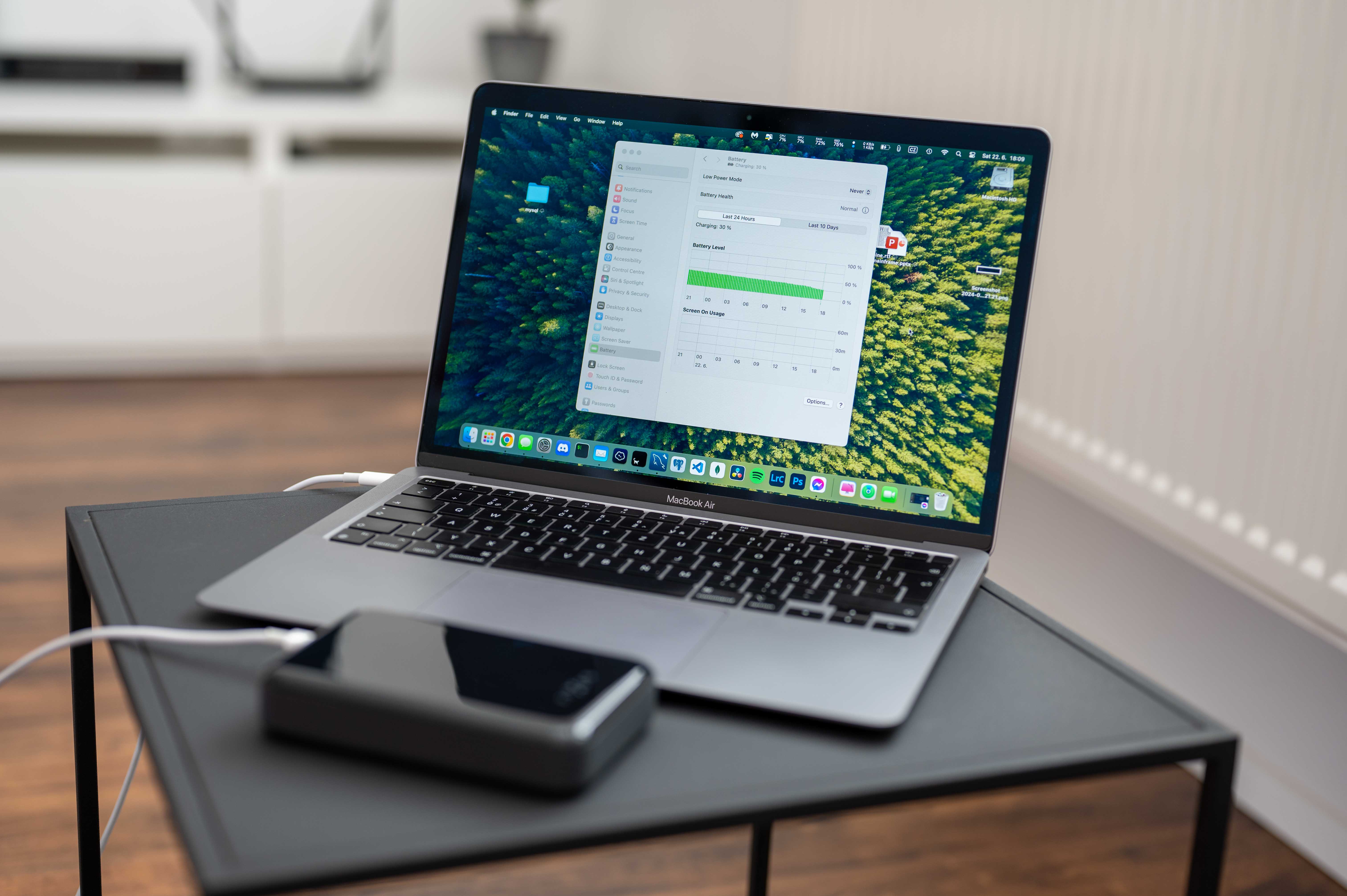 Pokud se ptáte na to, na co vlastně 20 000 mAh powerbanky stačí, pak vše samozřejmě závisí na tom, co konkrétně chcete nabíjet. Například MacBook Air se mi podařilo nabít s jeho 52,6 Wh baterií takřka jednou, což je i vzhledem ke ztrátám powerbanky za mě fajn. iPhone 15 Pro jsem nabil powerbankou takřka 5x, což mi taky nepřijde vůbec špatné, ba právě naopak. Vždyť jedno nabití MacBooku Air znamená ve výsledku hypoteticky dodání 18 hodin provozu pro přehrávání filmů či 15 hodin pro prohlížení webu. Pokud byste tedy denně pracovali na webu 7,5 hodin, pak vám nabíječka dodá ve výsledku šťávu na 2 dny práce, což je super. Vždyť s plně nabitým MacBookem v kombinaci s plně nabitou powerbankou se dokážete dostat až na 4 pracovní dny, což mi přijde bomba.