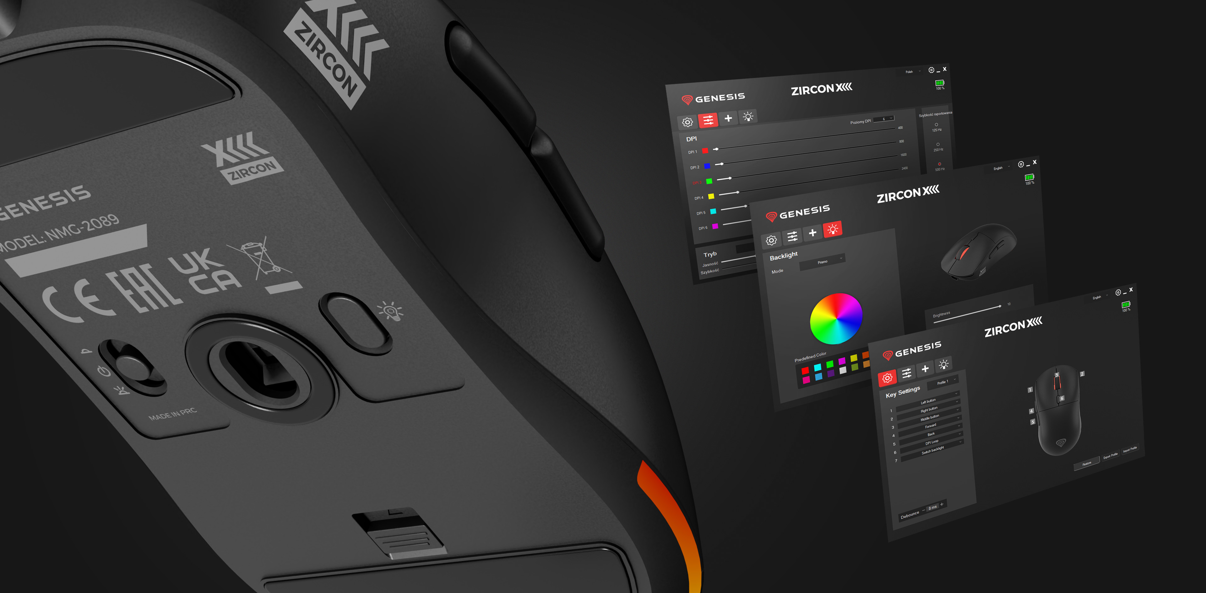 Uvnitř modelu GENESIS Zircon XIII se kromě kvalitního optického snímače a řady vyměnitelných komponent nacházejí špičkové součástky schopné zajistit bezproblémové hraní po dlouhou dobu. Patří mezi ně hlavní tlačítkové spínače (Kailh 8.0 s výdrží 8 milionů kliknutí) a odolný spínač TTC Gold. Výrobce nezapomněl ani na přídavný software, který přináší pokročilé aplikace, na vestavěnou paměť a řadu dalších funkčních ovládacích prvků umístěných na spodní straně myši.