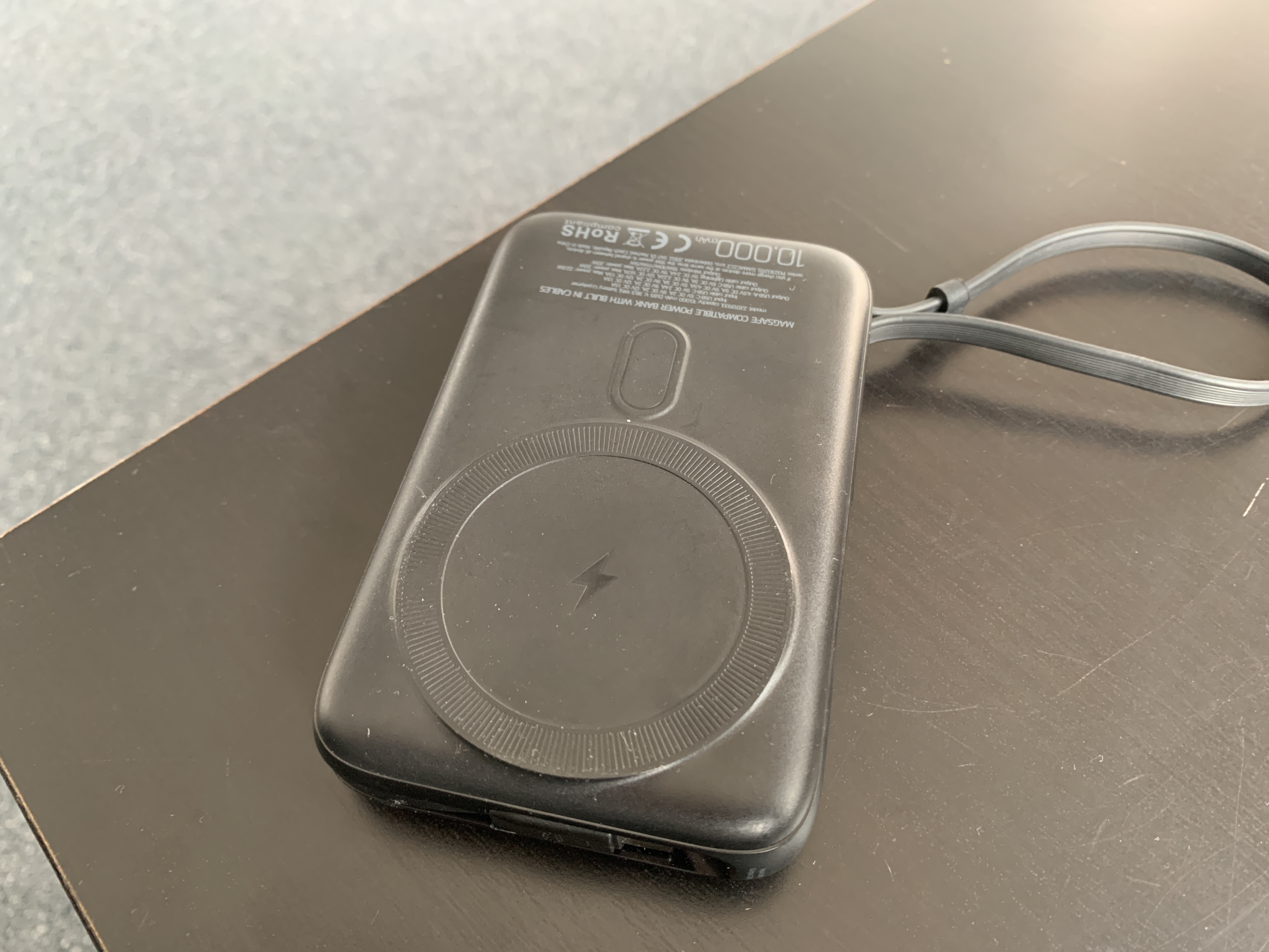 V malém těle této powerbanky se toho skrývá opravdu dost. Horní strana patří LED displeji, který ukazuje aktuální stav kapacity powerbanky. Na levé straně je k vidění na první pohled poutko, nicméně jedná se o Lightning kabel, který končí ve výklenku na levé straně. Na spodní a pravé straně naleznete USB-C kabel. Vrchní strana patří USB-C a USB-A konektoru. Vzadu je MagSafe a Qi plocha. Tato powerbanka zkrátka ždímá prostor na maximum.