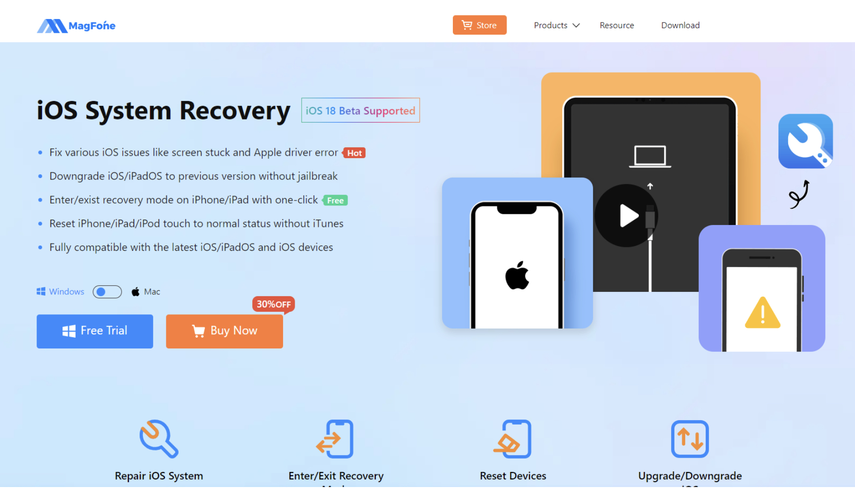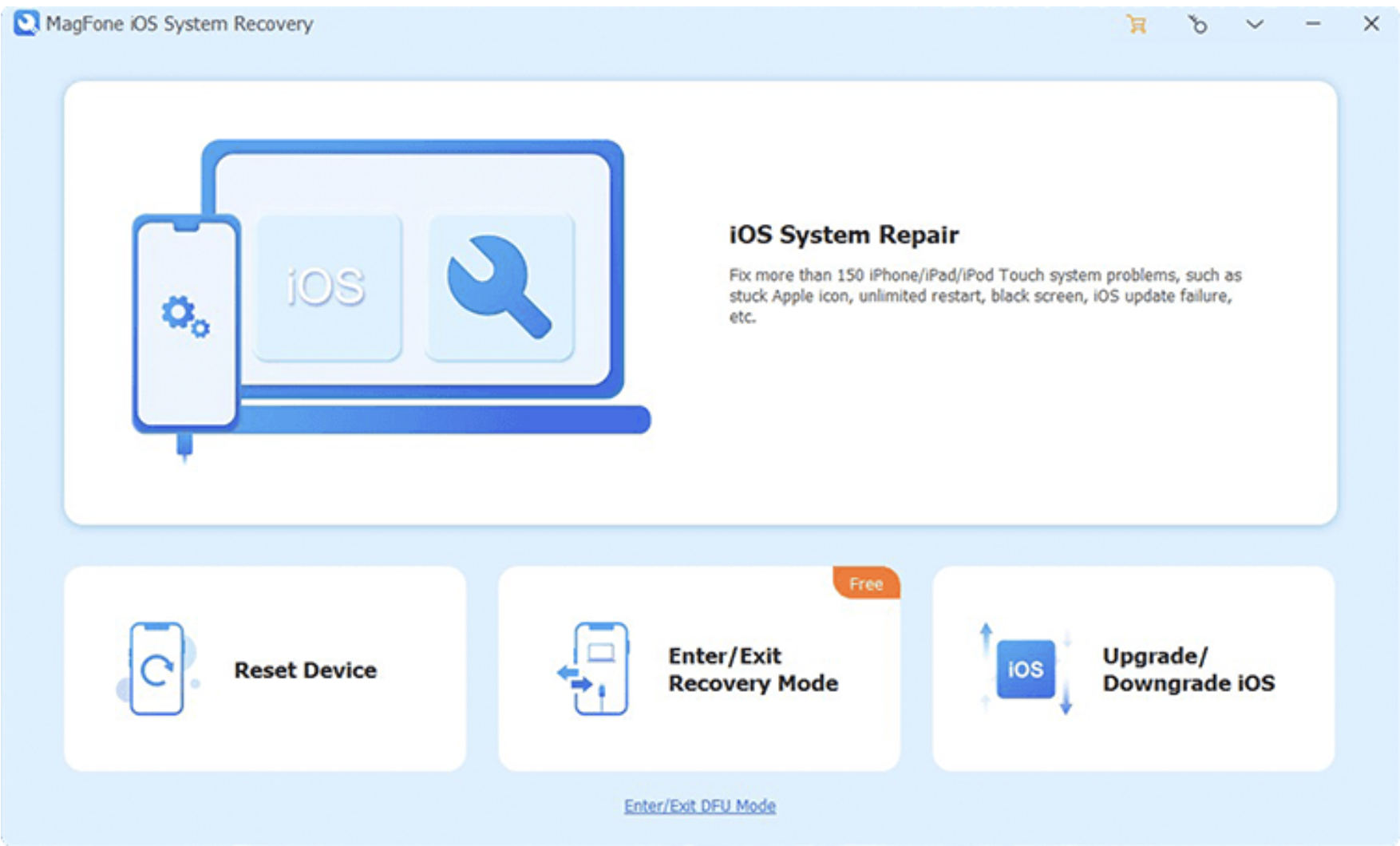 MagFone má typický software pro obnovení systému iOS, který opravuje až 150 běžných závad mezi různými zařízeními iOS, jako je displej nereaguje na dotyk iPhone, iPhone zaseknutý na logu Apple, zaseknutý v režimu obnovení nebo bílá obrazovka smrti atd. Tento software lze bezpečně stáhnout do systémů Windows i Mac, ať už se jedná o iPhone, iPad nebo iPod touch, tato aplikace vám skutečně pomůže s rychlou a bezpečnou opravou. Nyní vám ukážu, jak ji použít k opravě nefunkční dotykové obrazovky iPhonu.