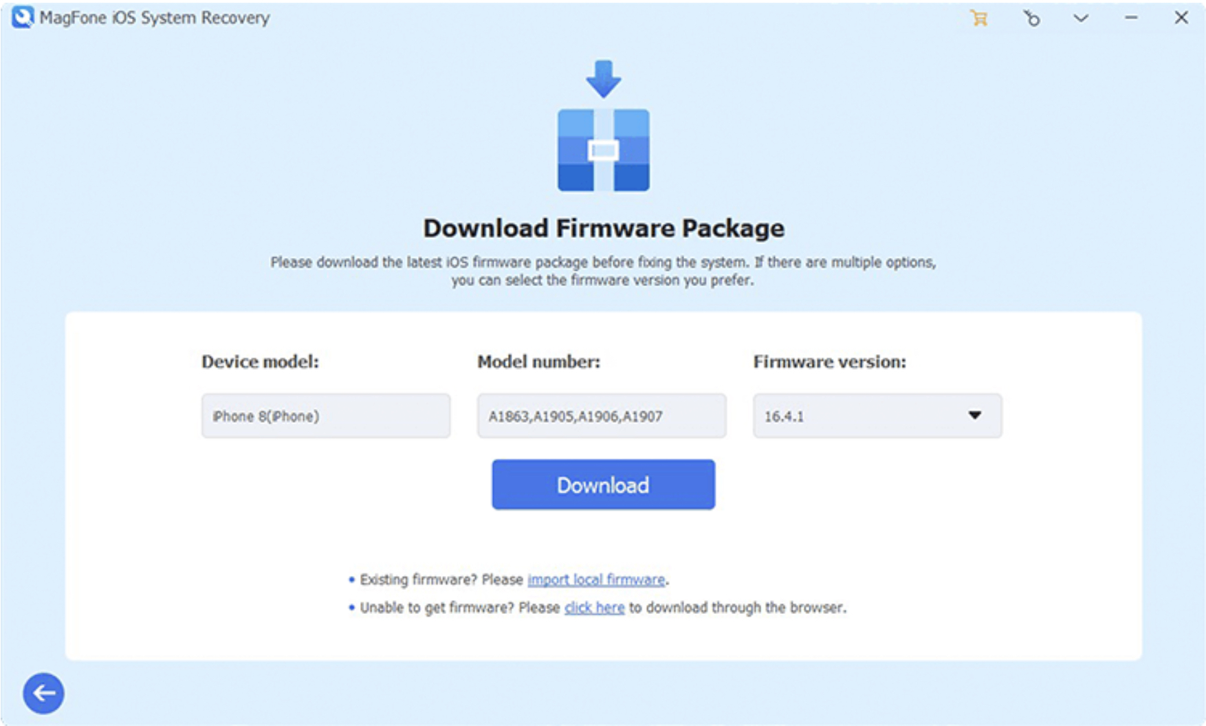 Poté si musíte stáhnout balíček firmwaru, abyste vyřešili problém s iPhonem. V rozhraní se zobrazí informace o vašem zařízení, protože jej software automaticky rozpozná. Zkontrolujte, zda jsou zobrazené informace o vašem zařízení správné. Pokud se vyskytne chyba, opravte ji. Kliknutím na tlačítko Stáhnout stáhněte požadovaný balíček firmwaru.