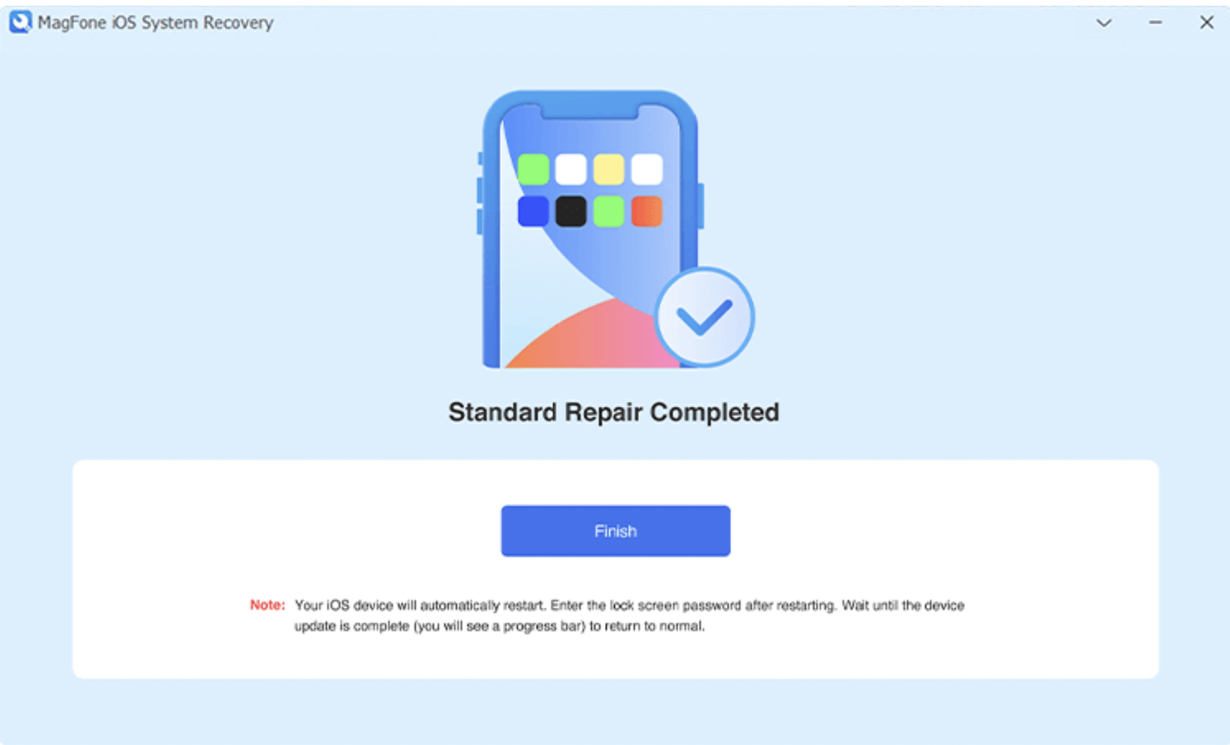 Kliknutím na tlačítko opravit zahájíte proces opravy. Ujistěte se, že je váš iPhone během celého procesu připojen k počítači. Po dokončení restartujte iPhone a zjistíte, že váš iPhone byl opraven.