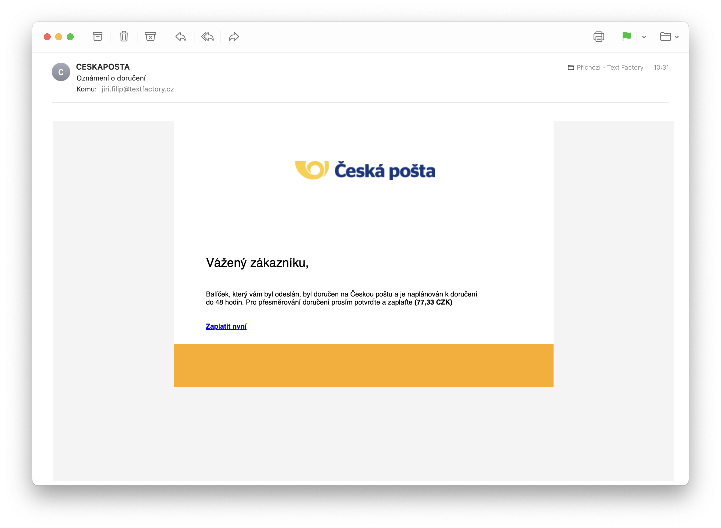 Českem se valí další vlna internetových podvodů. Tentokrát se však skoro až chce říci, že docela úsměvná, jelikož k jejímu odhalení stačí doslova pár kliknutí. Podvodné maily se tentokrát maskují za internetovou korespondenci České pošty, která vás v ní upozorňuje na nutnost potvrdit doručení vašeho balíčku skrze platbu. Co naplat, že si člověk jednak nic nepřesměroval a jednak nic neobjednal – to mail absolutně nereflektuje. Neinformuje vás vlastně o ničem jiném než o tom, že je třeba „za něco zaplatit nějakou částku“. Už to je samozřejmě samo o sobě dost podezřelé. Pokud by vám však tento „důkaz“ podvodu nestačil, stačí mrknout na přesnou adresu, ze které mail dorazil. Ta totiž s Českou poštou nemá absolutně nic společného, ba právě naopak být snad ani vzdálenější nemůže. Pochází totiž z Brazílie. Pokud vám tedy podobný mail dorazí, nevěnujte mu pozornost – jedná se o podvod.