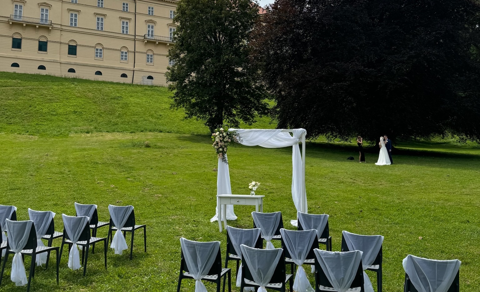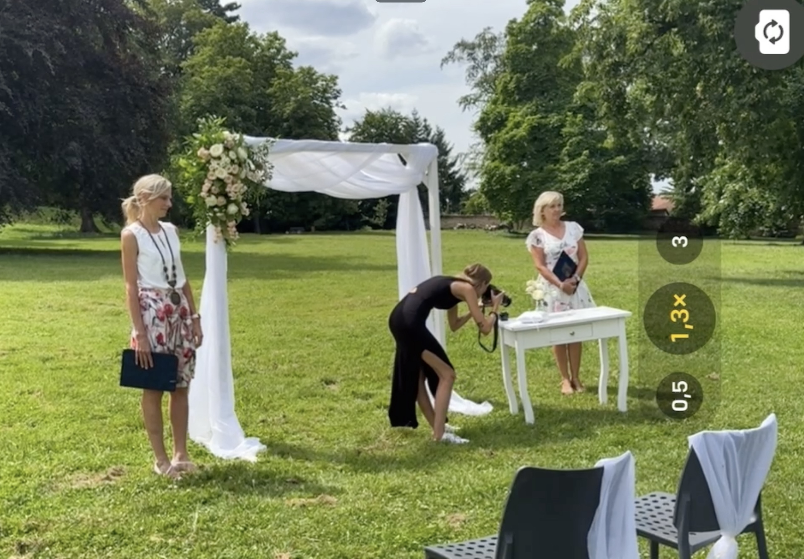 Jelikož jsme se s manželkou v minulosti dohodli, že nám budou bohatě stačit svatební fotky a video není třeba, asi vás nepřekvapí, že v den svatby jsme začali alespoň elementární video řešit, protože tchýně začala spekulovat nad tím, že by vlastně nebylo od věci nějaký takový záznam mít.  To jsme však vyřešili tou nejjednodušší cestou – prostě jsme jen k FaceTime videohovoru zapnuli nahrávání obrazovky iPhonu, jehož hledáček směřoval na obřad a bylo vystaráno. Tímto stylem sice nenahrajete zvuk, nicméně vzhledem k tomu, že se natáčelo relativně z dálky a zároveň z prostoru, kde už byli svatebčané, ve výsledku by stejně řeč oddávajícího nebyla slyšet. Obrazový záznam tedy máme a to nám ve výsledku i stačí. Za mě tedy geniální řešení. Pro úplnost ještě dodám, že odchod špalírem a tak podobně už samozřejmě zdokumentovali svatebčané – zde šlo skutečně jen o zachycení toho, jak stojím u slavobrány.