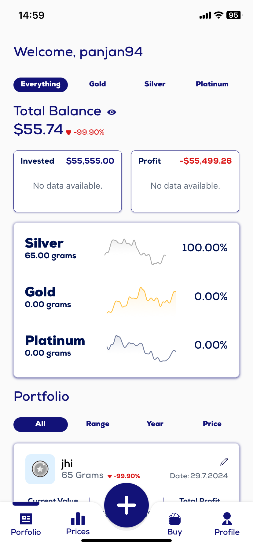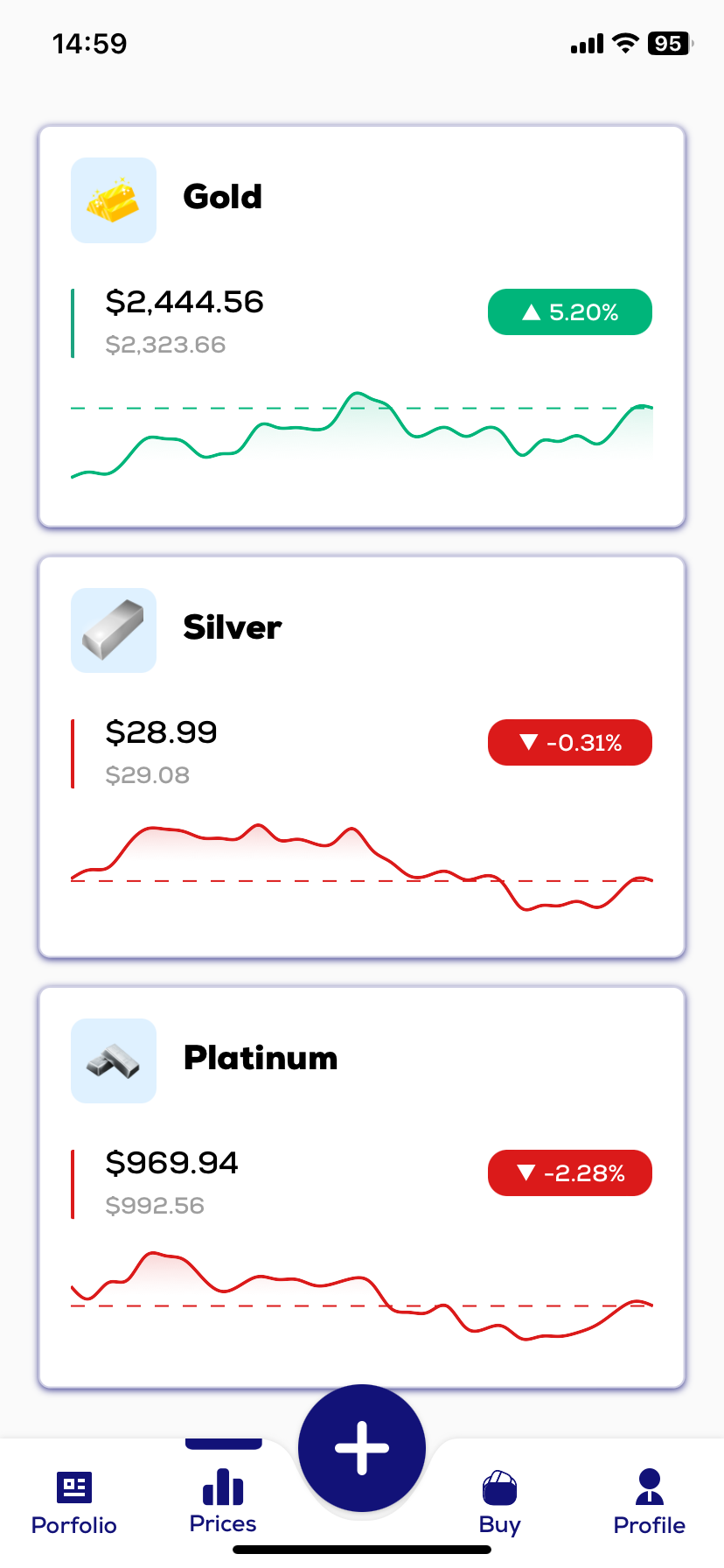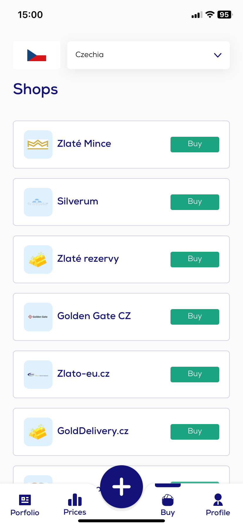Aplikaci GoldFolio naleznete a stáhnete zdarma v App Store či Google Play. Po stažení postačí, když se zaregistrujete pomocí Apple ID. Po autentifikaci máte tedy vyhráno a můžete bez zbytečných odkladů zkoumat, co tato aplikace nabízí. Hned na úvodní straně můžete vidět své portfolio. Produkt přidáte kliknutím na velké tlačítko + ve spodní části obrazovky. Zde navolíte kov (zlato, stříbro, platina), čistotu kovu (počet karátů), množství a investovanou částku. V úvodním portfoliu vidíte, jak by se investice po čase vyplatila, přičemž můžete volit z opravdu mnoha různých kombinací.