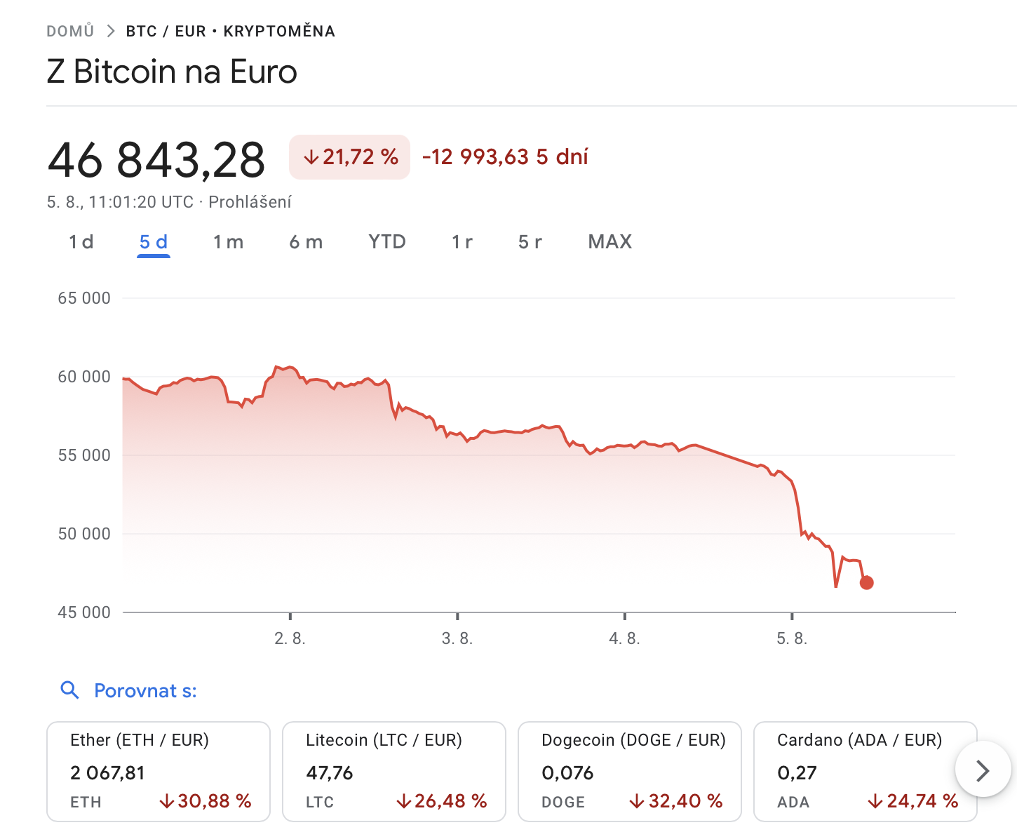 Dnešní den aspiruje na to, aby se zapsal do dějin jako nejhorší den v historii kryptoměn. Poté, co se ukázaly výsledky amerických technologických společností a akcionáři začali hojně mluvit o tom, že je již nebaví čekat na to, co vlastně dokáže AI a jak jim vydělá peníze, se stává realitou to, čeho se mnoho lidí obávalo již dlouhé měsíce nebo roky. Hodnoty akcií klesají po celém světě z obavy o recesy, která se zřejmě v USA stává čím dál tím reálnější. Na to však nereagují jen burzy samotné, ale také kryptoměny a nejznámější z nich ztratila během posledních pěti dní více než 20 % své hodnoty. Bitcoin se obchodoval ještě 1.8. 2024 za částku téměř 60 000€ za 1 BTC, nyní o necelých pět dní později se 1 BTC prodává za částku 46 599€, tedy o téměř 400 000Kč méně.