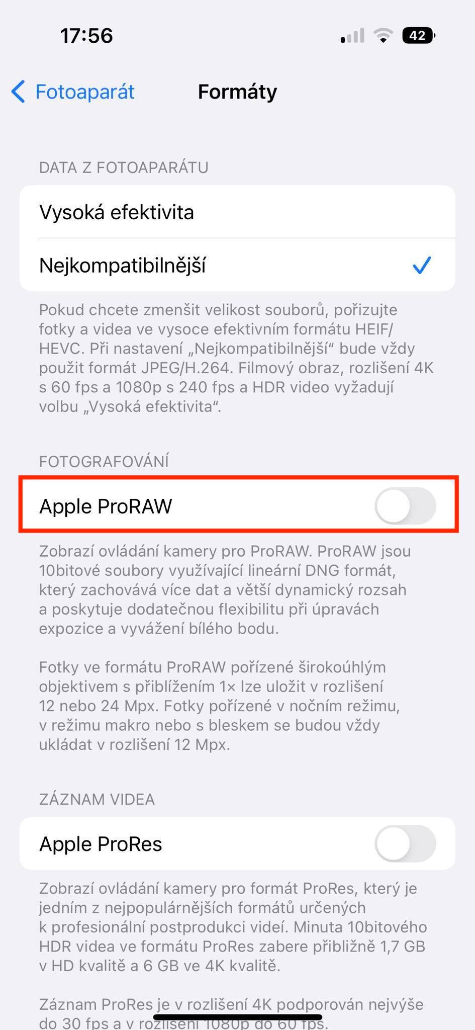 - V sekci Fotografování aktivujte Apple ProRAW.
