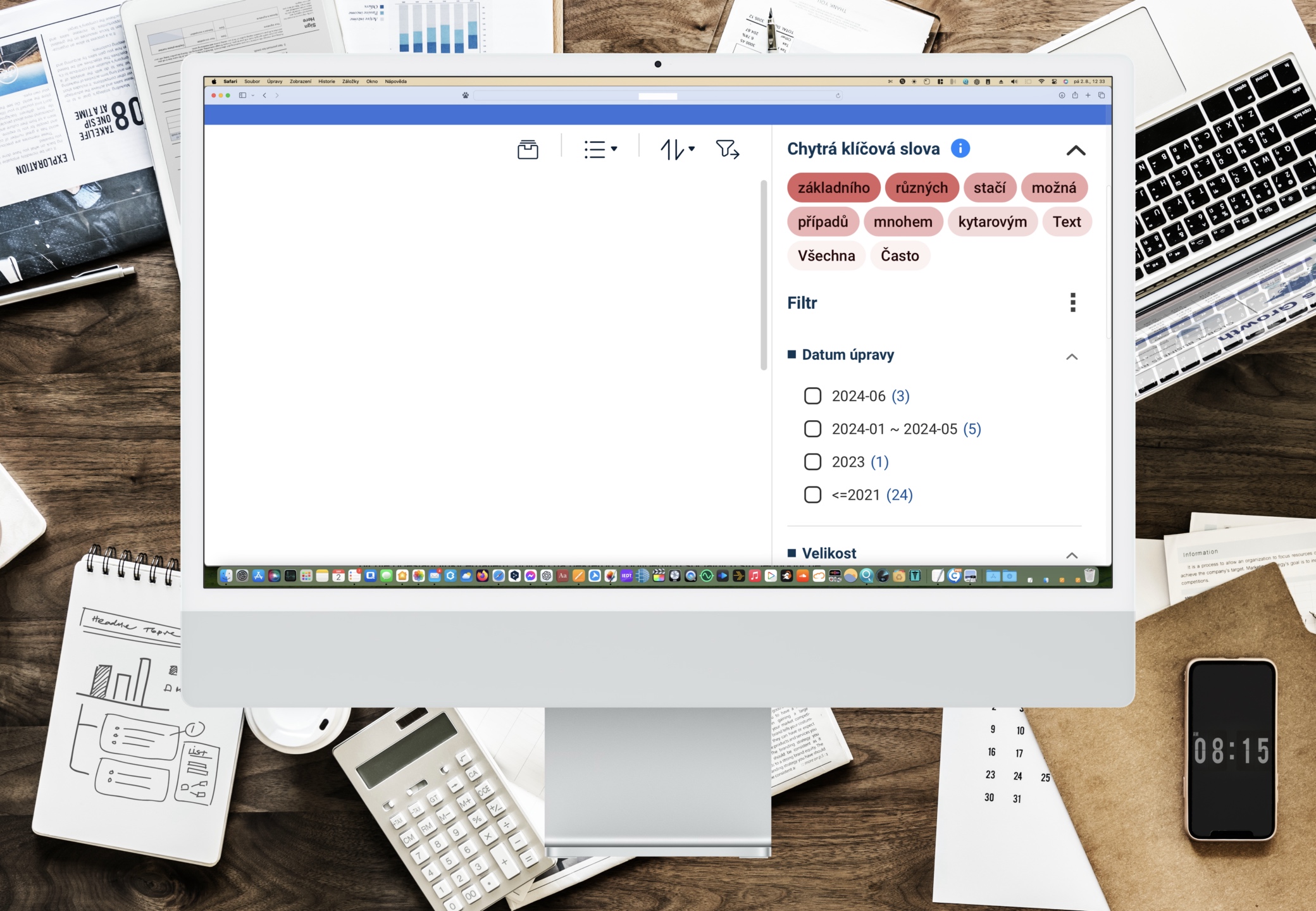 Pod řádkem pro zadávání se nachází velmi praktická sada odkazů, jež průzkum omezí na: obrázky, video, hudbu, dokumenty, PDF nebo importované e-maily. Pod ikonou se třemi tečkami můžete nalezené výstupy zredukovat taktéž na všechny nebo jen vybrané typy formátů kancelářského balíku Microsoft Office.