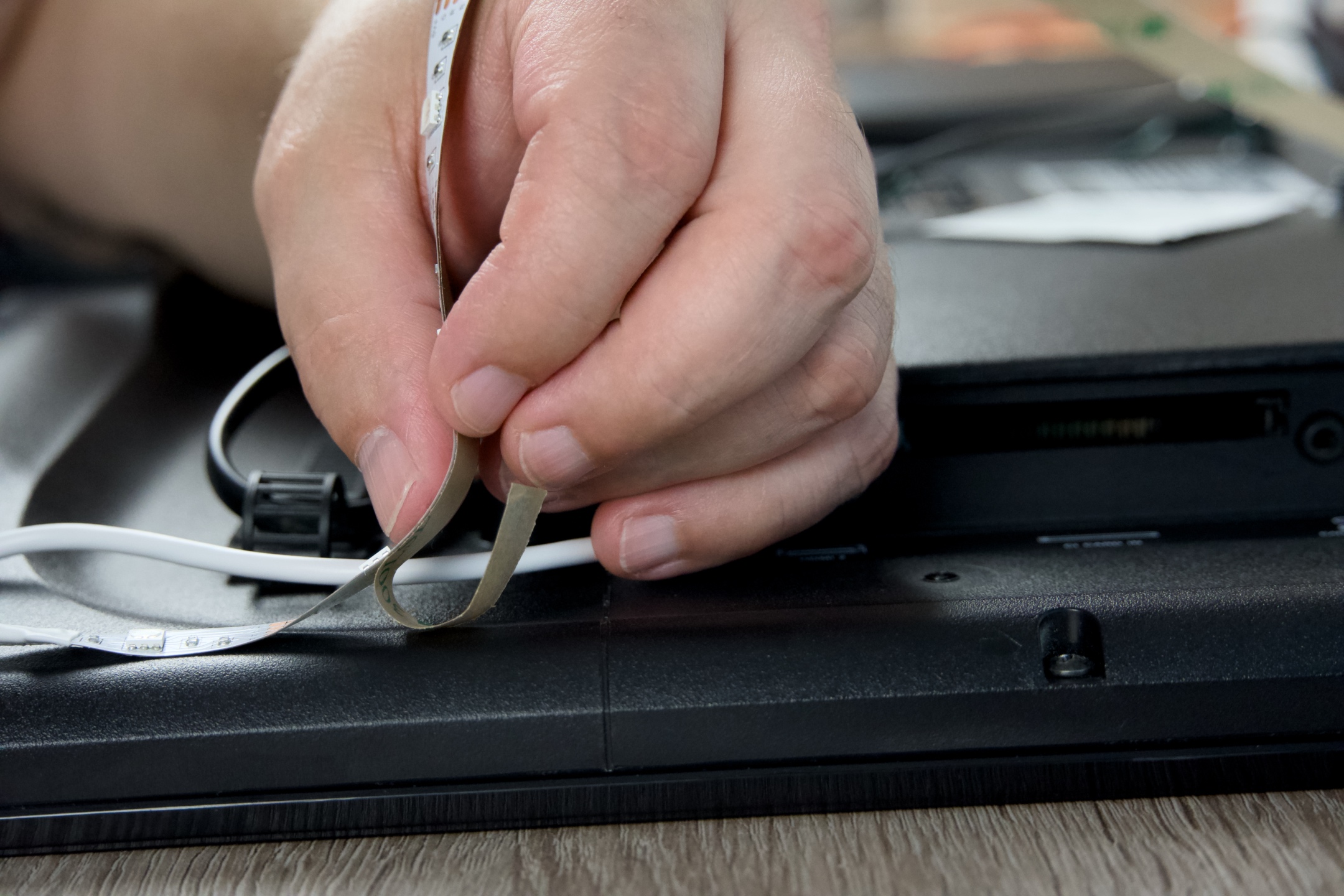 Umístění na televizi nepředstavuje nic složitého. Důležité je, aby byl povrch čistý a suchý. Poté již nic nestojí v cestě postupnému odstranění ochranného proužku a nalepení adekvátním přítlakem napravo či vlevo v závislosti na přístupu ke zdroji napájení. Ideálním řešením je nabíječka odpovídající požadovaným specifikacím. Zahnutí v rozích a připevnění ovládacího boxu pak napomohou zmíněné klipy.