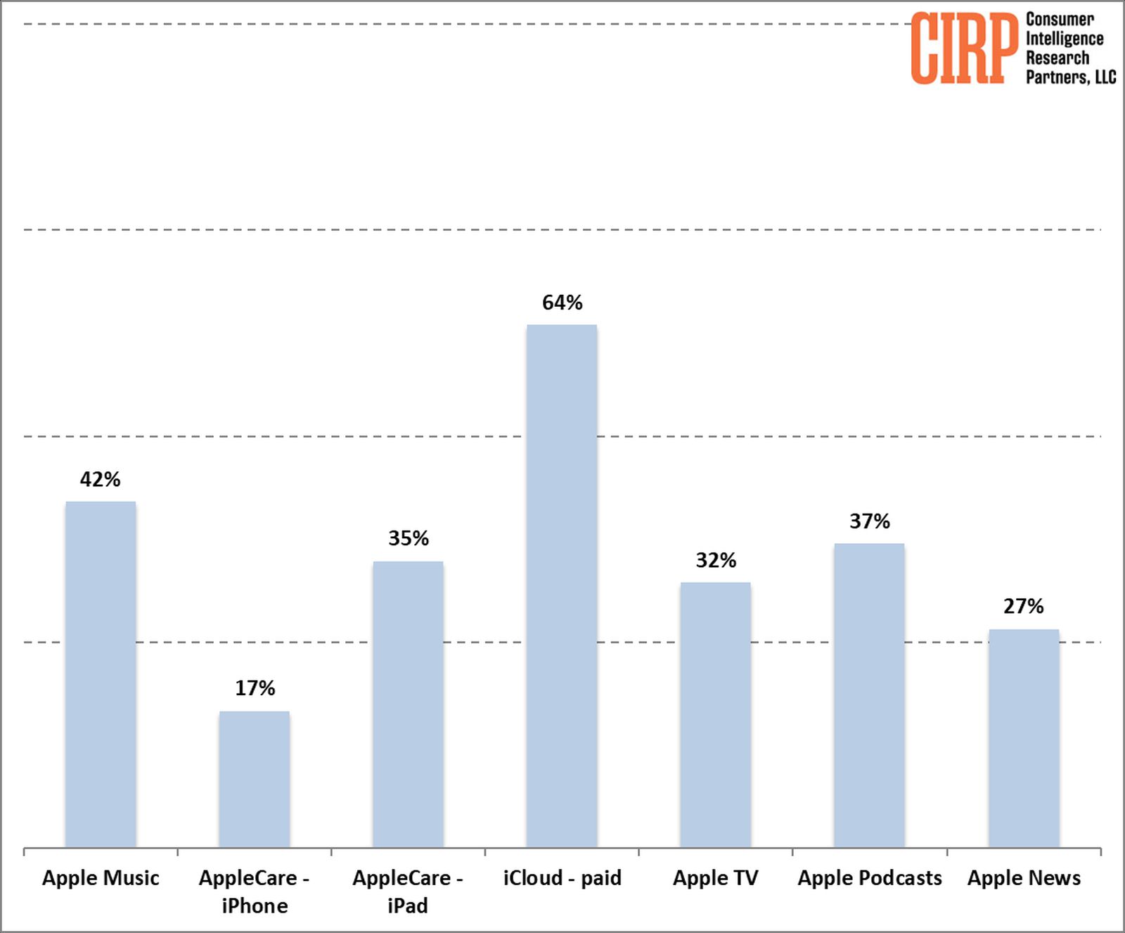 Příjmy Applu z jeho služeb rok od roku rostou, čemuž se vzhledem k tomu, jak roste jeho uživatelská základna i počet služeb, které nabízí, ve výsledku nedá divit. Tušíte však, jaké služby si uživatelé nejvíce předplácí? Přesně na tuto otázku se nyní rozhodl odpovědět průzkum analytiků z CIRP a ačkoliv proběhl jen v USA, vzhledem k jeho vítězi je víceméně jasné, že pravděpodobně z velké části odráží nastavení celého světa. Na výsledky se můžete podívat na grafu níže.