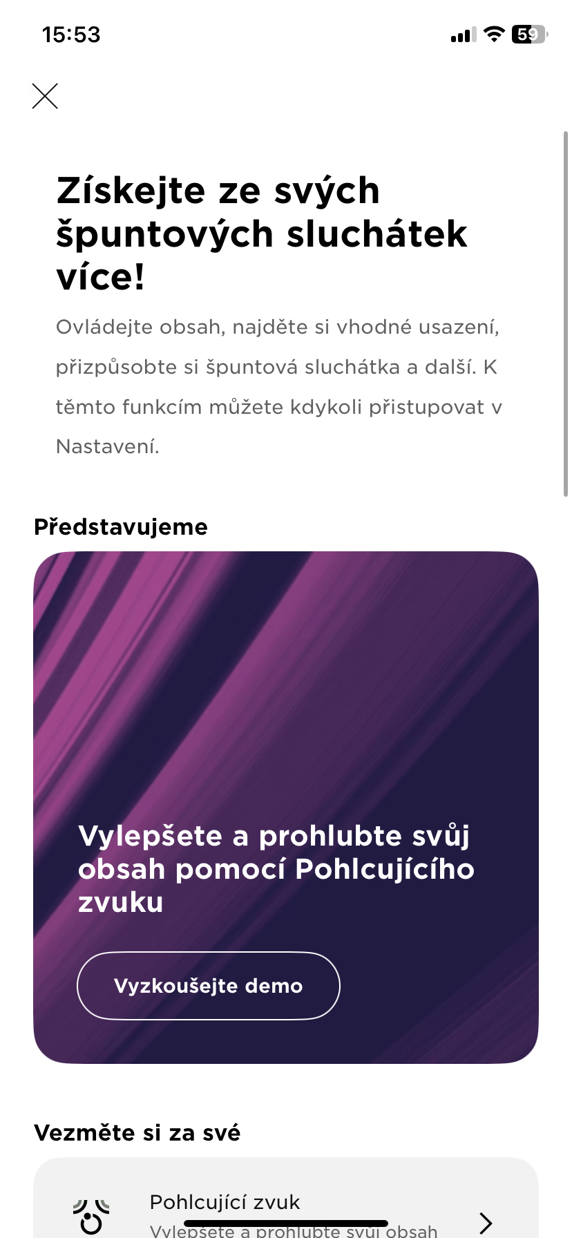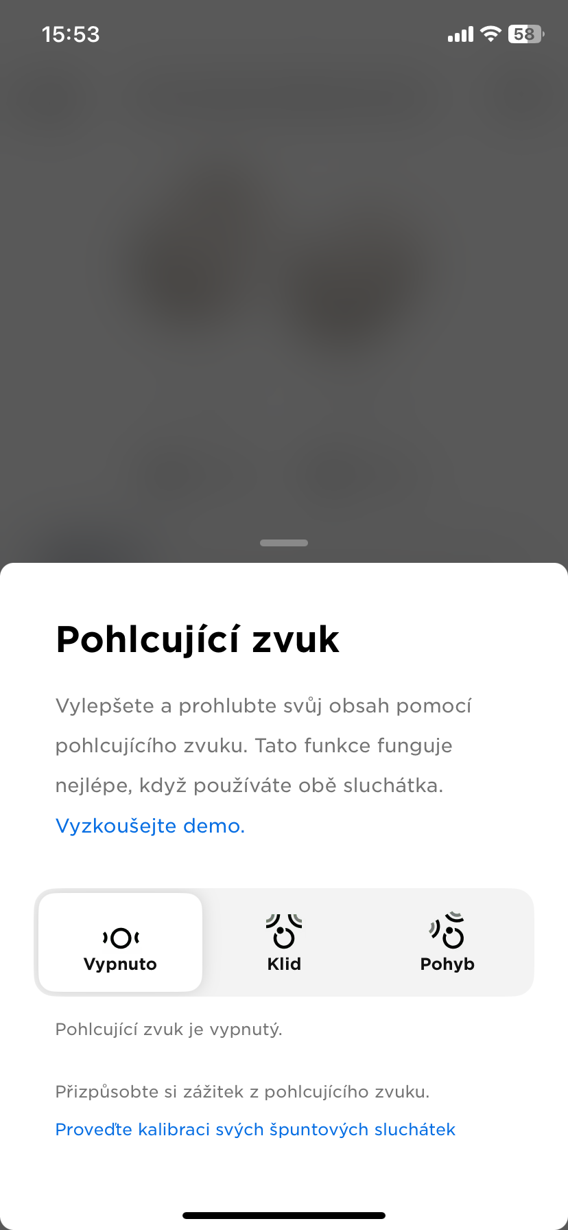 Výše jsem zmínil, že sluchátka nabízejí režimy hudby. V aplikaci můžete přepnout na režim nesoucí název „Pohlcující zvuk“. Ten se dá rozdělit na pohybový a statický. Navolíte-li pohybový, dostanete pocit koncertu, kdy vás obklopuje jakási ozvěna a iluze rozpínajícího se zvuku. Daleko zajímavější je ovšem statický režim. Zvuk s umístí v prostoru tam, kam se zrovna díváte. Jakmile se pohnete, zvuk zůstává na tom samém místě, a postupně se posune zase před vás. Když zavřete oči a začnete se pomalu otáčet, máte v tichém prostředí skutečně pocit, že kousek od vás je onen zpěvák. Jde o skvělou ukázku technologie, ze které mi šel při prvním poslechu mráz po zádech. Těžko se to popisuje a je třeba to zažít. A ideálně skutečně v tichém prostředí.
