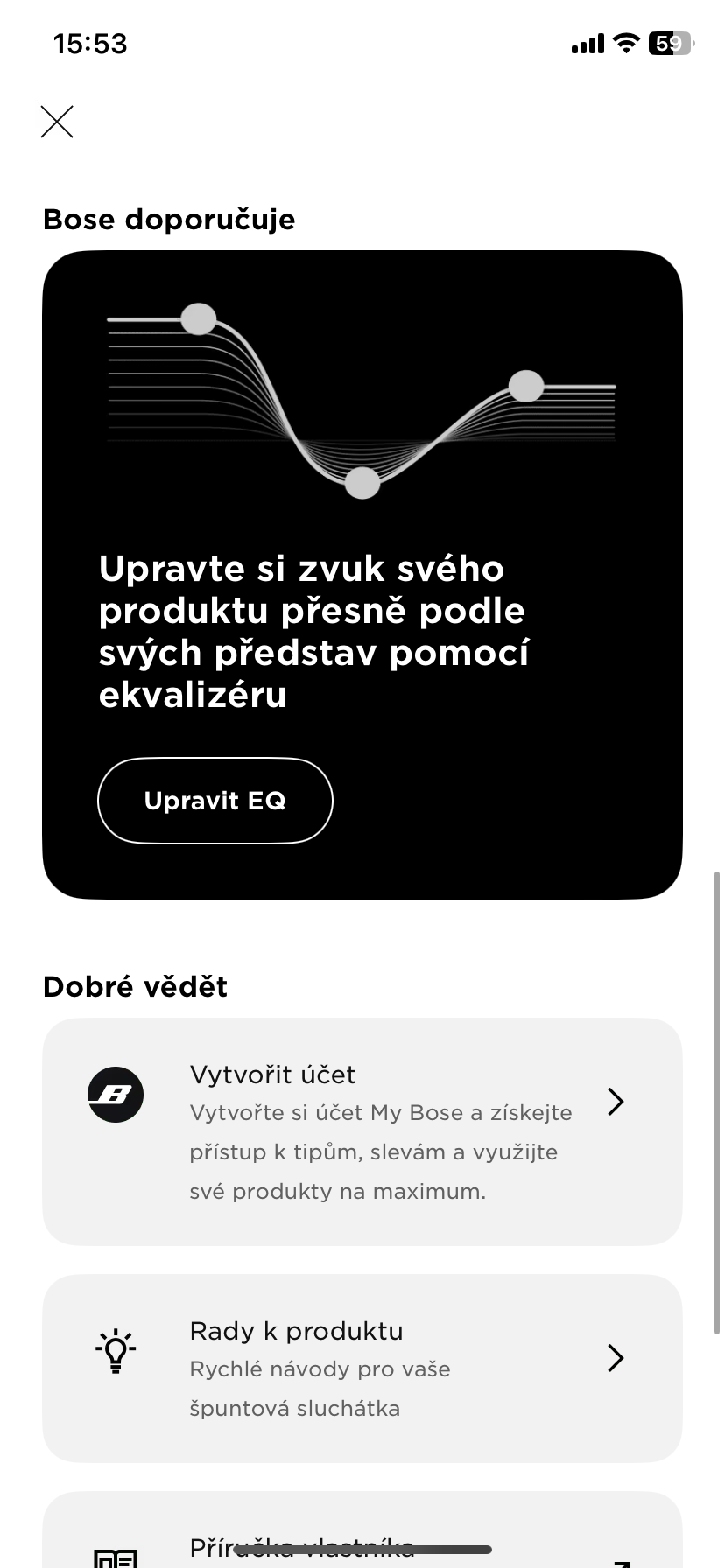 Párování je velmi jednoduché. Stačí otevřít krabičku, stisknout tlačítko na krabičce a v aplikaci Bose, kterou zdarma stáhnete v App Store, vyhledat ona sluchátka. Po úspěšném spárování dostanete v aplikaci školení, kterak sluchátka správně nosit a kalibrovat. To se opravdu hodí a za sebe musím říct, že jsem si toto proškolování prošel hned dvakrát. V aplikaci uvidíte aktuální samozřejmě aktuální stav baterie. Je ale možné dělat celou řadu dalších věcí. Jak již bylo řečeno, lze přepínat režimy, programovat tlačítka, ale také zde naleznete ekvalizér, v němž je možné upravovat výšky, basy a středy. Ekvalizér funguje a rozdíly v nastavení poznáte. Se zvukem jako takovým lze tedy do jisté míry kouzlit. Aplikace tedy není jen nějaká „obtíž navíc“, nýbrž ji budete skutečně využívat. Dobrou zprávou pak je, že je v češtině.