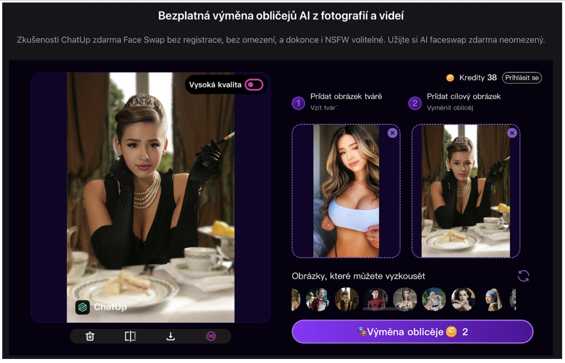 Proměňte své selfie nebo fotografie v něco zábavného a vzrušujícího jen s pomocí dvou obrázků. Funkce výměny tváří od ChatUp AI vám umožní vytvořit zábavná videa v žádném čase. Vyberte si z široké nabídky šablon obsahujících filmové scény, zábavné postavy a krásné portréty pro rychlou a snadnou experimentaci.