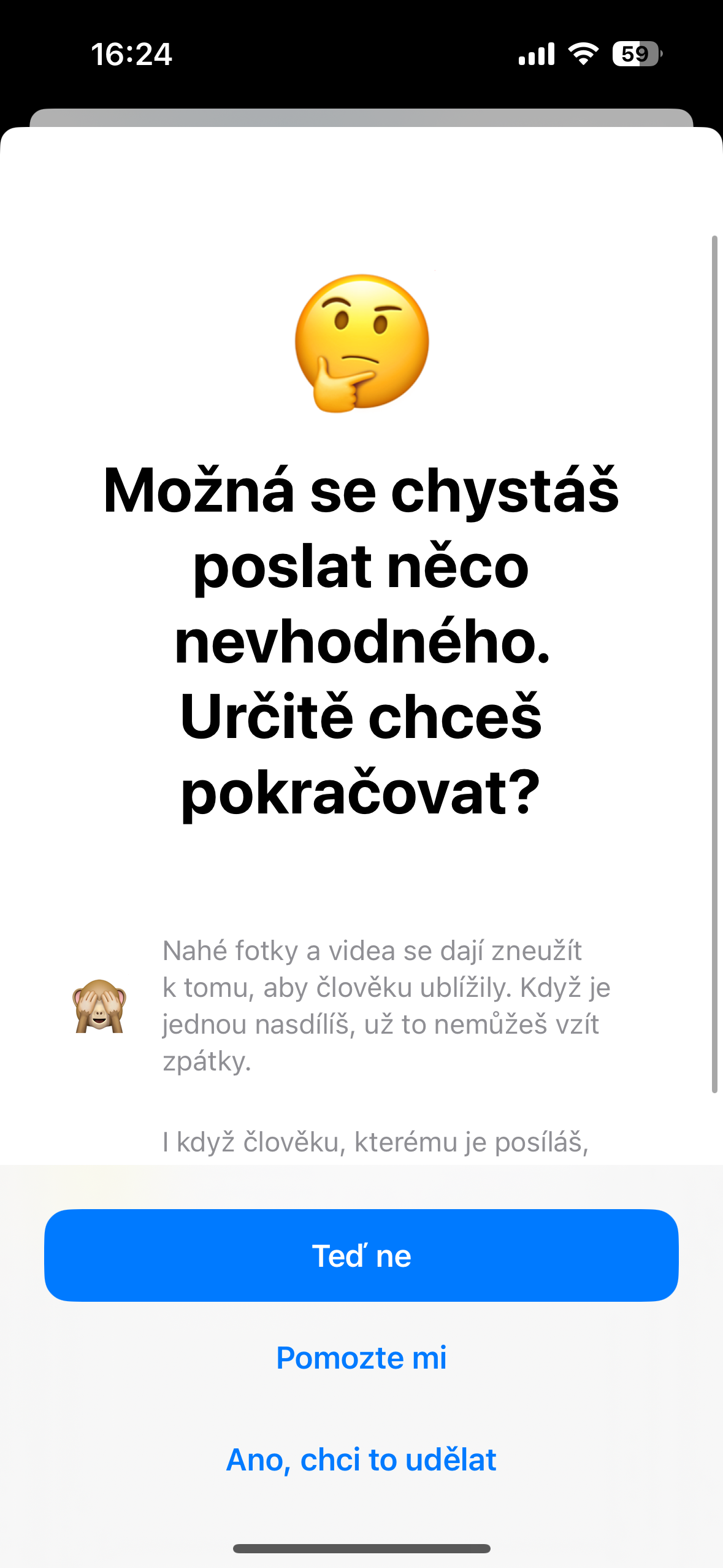 Pokud jste s jedním partnerem 15 let, máte spolu dítě a je to vaše manželka, pak je čas od času celkem cool, že vám pošle nějakou tu fotku ze sprchy nebo něco podobného. O tom, že by to neměl nikdo s nikým dělat bez toho, aniž by spolu měli ti dva vztah a obě strany to chtěly, o tom se vůbec není potřeba bavit, ovšem pokud se skutečně jedná o manželku a chce vám udělat radost, tak nevidím důvod, proč by nemohlo být někde v nastaveních iOS možné vypnout upozornění na to, že posíláte nebo si prohlížíte obsah, který by vás mohl pohoršit. Byl jsem u porodu svého syna, není nic, co se fotek mé ženy týká a mohlo by mě to pohoršit.