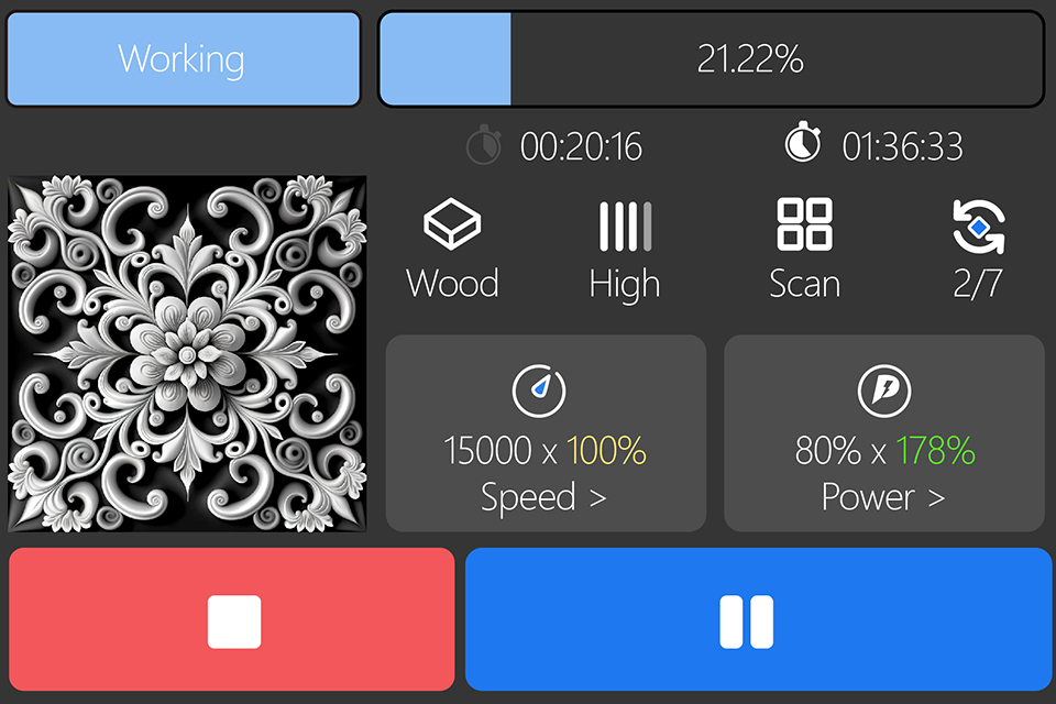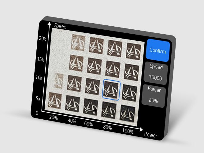 Gravírka je vybavena výkonným 20W laserem, který v kombinaci s rychlostí gravírování 10 – 500 mm/s (až 30 000 mm/min) umožňuje efektivní a přesnou práci. Osadit ji lze nicméně i výkonnějším 40W laserem pro náročnější zakázky. Díky zabudovanému Air pump systému s výkonem 30 l/min, který je součástí balení, dosahuje lepšího chlazení a vyšší kvality gravírování.