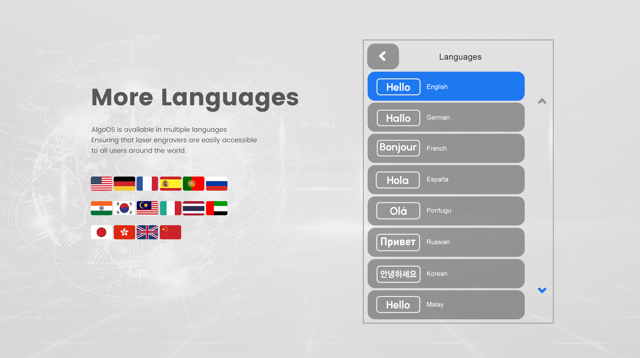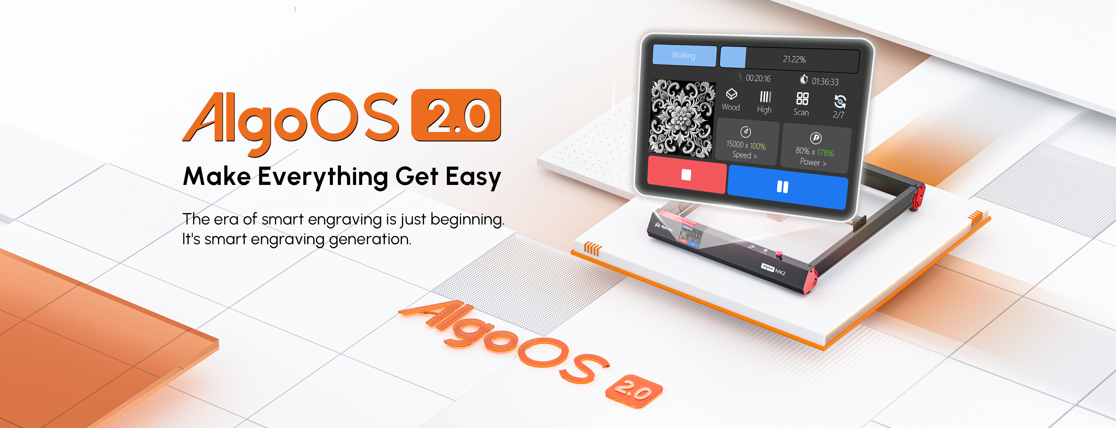 AlgoOS 2.0 přináší revoluci v ovládání gravírovaček, jelikož na jejich displeje přináší snadnou a intuitivní dotykovou interakci. Tento operační systém, inspirovaný designem chytrých telefonů, nabízí uživatelsky přívětivé rozhraní, které zjednodušuje ovládání bez nutnosti dlouhého učení. Uživatelé mohou jednoduše zadat heslo pro rychlé a bezpečné připojení k Wi-Fi, přičemž systém podporuje rychlé OTA aktualizace, které lze provést jedním kliknutím bez nutnosti stahování softwaru do počítače.