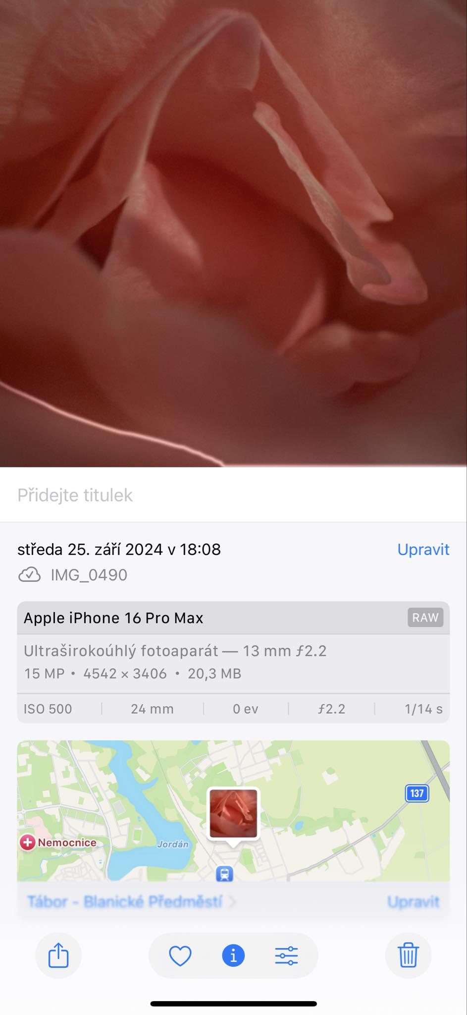 Když se v technických specifikacích Applu dočtete o 48Mpx makro fotkách, zřejmě si valná většina z vás představí fotky focené přes makro režim – tedy jinými slovy ty fotky, které člověk vyfotí ve chvíli, kdy mu na displeji iPhonu svítí ikona kytičky signalizující, že se mu foťák „přepnul“ do makro režimu a je tedy schopen ostřit na bližší předměty. Když však v tomto režimu na iPhone 16 Pro fotíte, zjistíte, že se dostanete maximálně na 15Mpx a to navíc (asi) jen v případě aktivního ProRAW formátu. Je jedno, jak focená scéna vypadá, kolik je v ní světla a tak podobně – doposud se nám zatím nikdy nepodařilo překonat při focení v tomto režimu rozlišení 15Mpx a to i přesto, že fotka zabírala třeba 20MB.