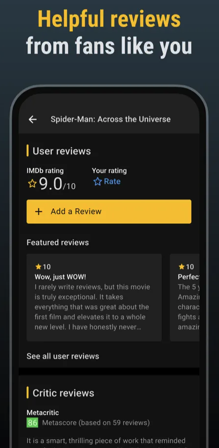 IMDb je jako filmová encyklopedie přímo ve vašem telefonu. Ať už hledáte informace o nejnovějších blockbusterech, starých klasikách nebo nezávislých filmech, v aplikaci IMDb je najdete. Kromě detailních popisů filmů, seriálů a dokumentů vám aplikace poskytne také rozsáhlé životopisy herců, režisérů a dalších tvůrců. IMDb není jen databáze, ale také živá komunita milovníků filmů. V aplikaci můžete hodnotit filmy, psát recenze, diskutovat s ostatními uživateli a sledovat, co právě sledují vaši přátelé.