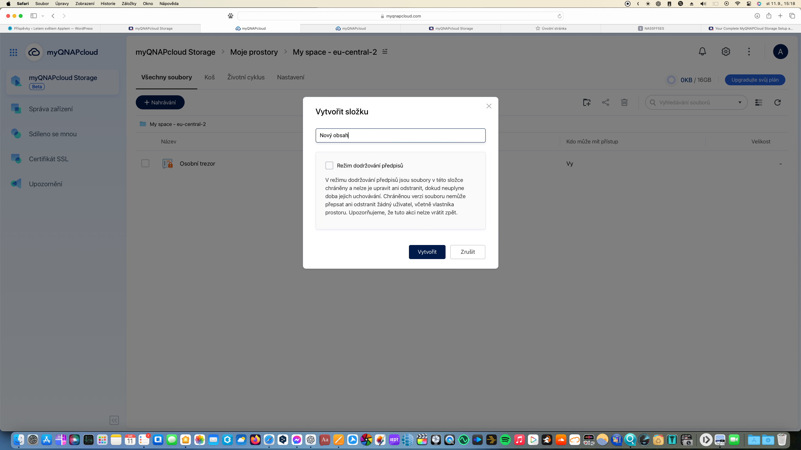 Prvním krokem, který je třeba provést před tím, než začnete myQNAPcloud Storage využívat, je označením oblasti (nám nejblíže se nachází datové centrum ve Frankfurtu) vytvořit svůj úložný prostor. Poté již můžete nahrávat a přejmenovávat soubory i pracovat se složkami.